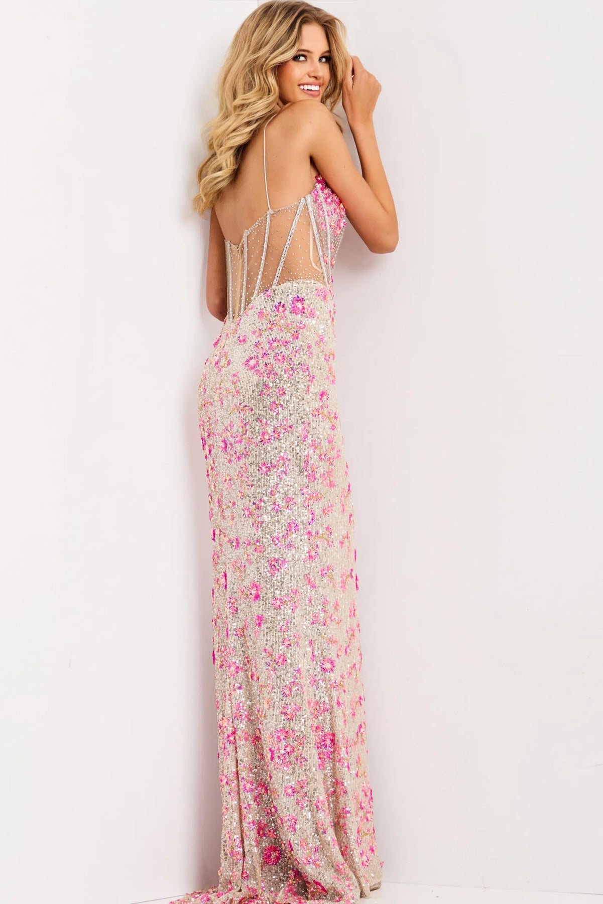 Make an unforgettable entrance in the Jovani 45774, a floor-length gown designed to celebrate your elegance and poise. The plunging illusion corset neckline paired with a sleek sheath silhouette creates a refined, flattering profile that commands respect. Luxurious beaded tulle embellished with intricate floral sequins and 3D appliqués catches the light beautifully, while strategic beaded details enhance every curve. The structured sheer boned bodice ensures you feel supported and confident all evening, complemented by delicate spaghetti straps. A daring high slit provides graceful movement, and the open sheer back with beaded straps reveals an alluring finishing detail. Perfect for galas, proms, and red-carpet moments where you want to feel absolutely radiant.
