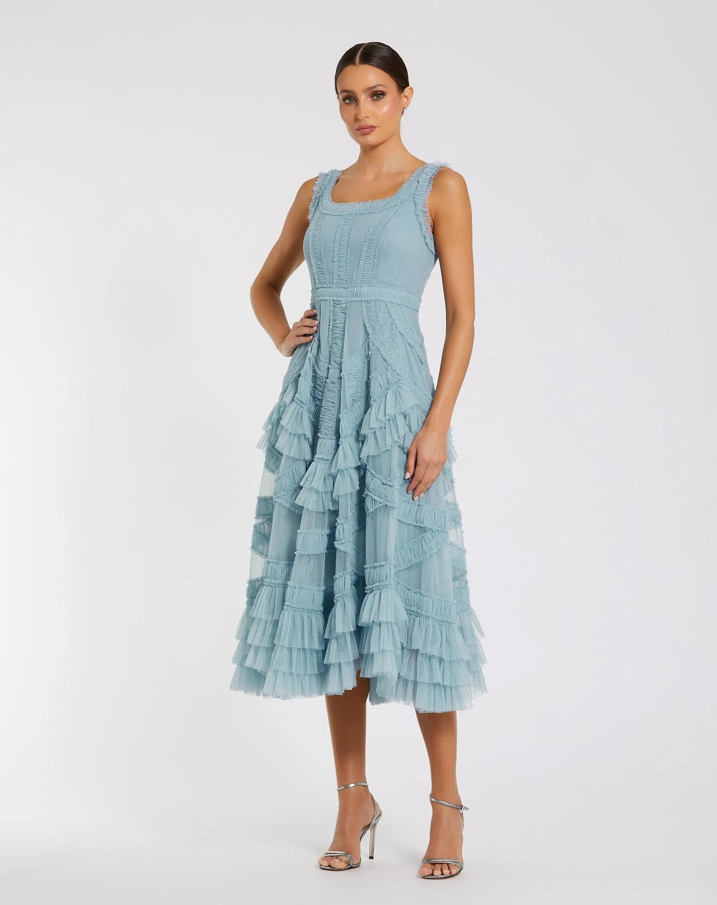This sleeveless midi dress features delicate micro ruffles throughout, with cascading ruffles along the skirt that create beautiful movement. The scoop neckline and A-line silhouette enhance its chic, feminine appeal, making it perfect for a stylish daytime look.