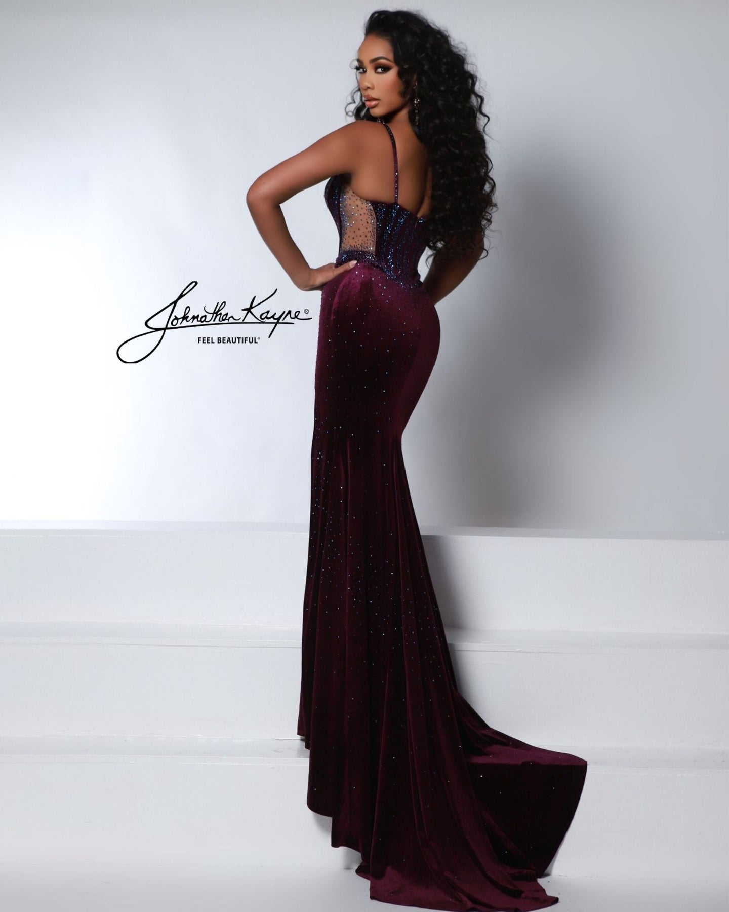 Step into the spotlight with the Johnathan Kayne 2948 Dress, designed to turn heads. Its exposed boning bodice flatters your figure, while delicate spaghetti straps keep things light and flirty. The deep V neckline adds a dash of drama, and mesh side panels bring just the right amount of playful allure. Perfect for making unforgettable entrances!