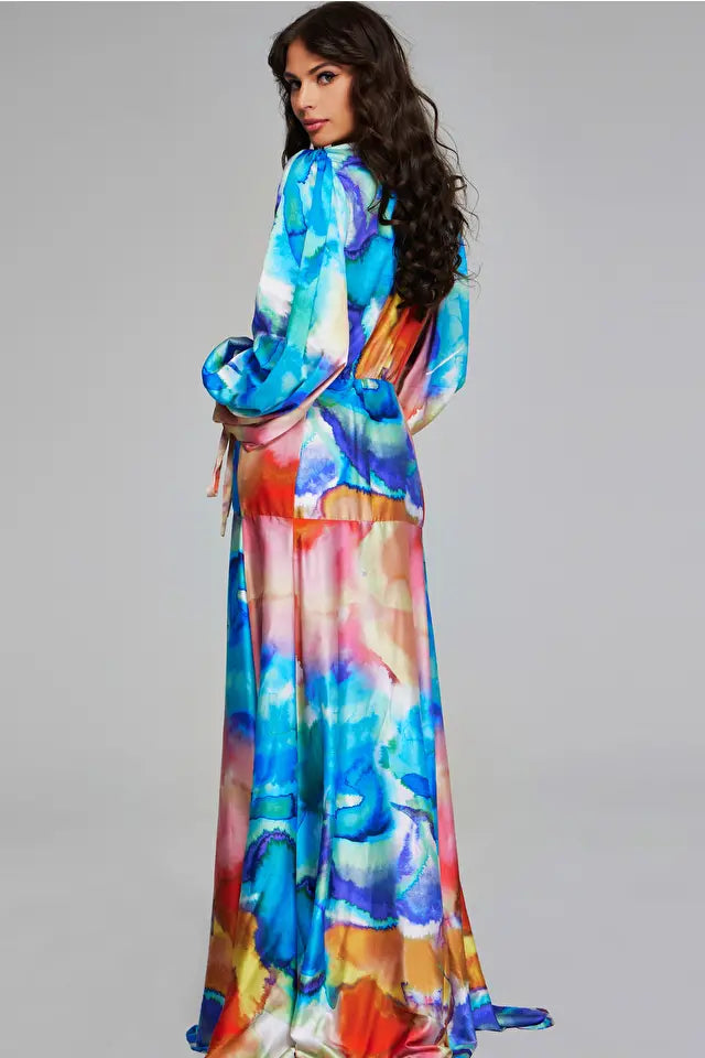Unleash your inner trendsetter with JOVANI 37669. This stylish dress features a colorful watercolor print, surplice v-neckline, and bishop sleeves. The A-line silhouette flatters every curve, while a sweeping train adds a touch of drama. Perfect for celebrating your divine femininity. Model is showcasing the Multi color option.