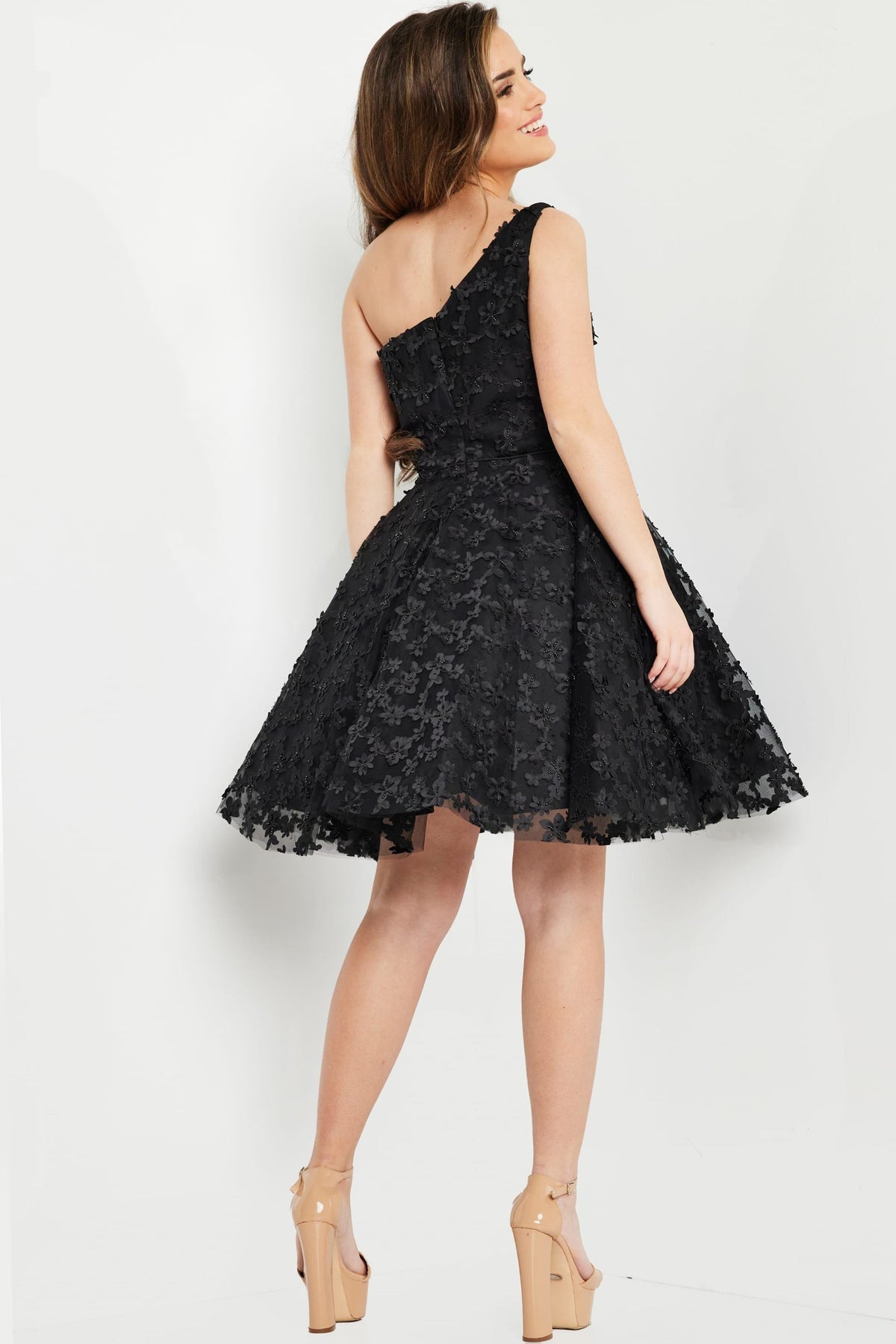 Dare to turn heads in this stunning Black One Shoulder Fit and Flare Dress! With its cheeky one-shoulder neckline and flirty A-line silhouette, this short dress is your ticket to effortless elegance. Adorned with gorgeous beaded floral embellishments, it's the perfect blend of sass and sophistication. The luxe lace fabric drapes beautifully to flatter every figure, while the sleeveless, closed-back design keeps things sleek and modern. Whether you're hitting a cocktail party or making a grand entrance at an event, this dress delivers show-stopping style with playful flair.