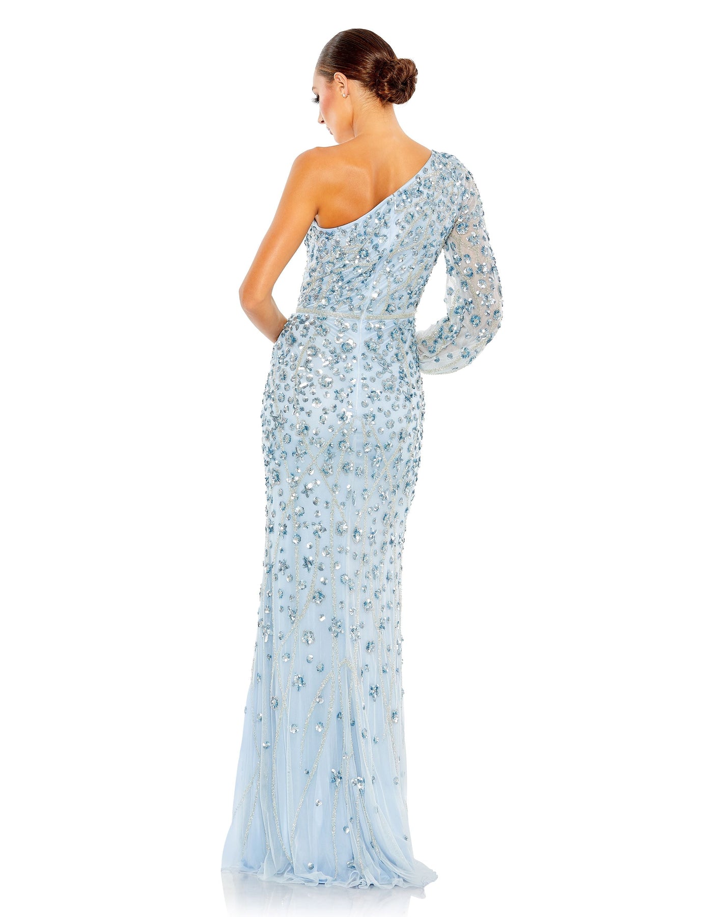 Make a striking impression with our Embellished One Sleeve Faux Wrap Gown. This exquisite gown features intricate embellishments that add a refined touch to your ensemble. The unique one sleeve design and faux wrap silhouette offer a chic and elegant look, ideal for formal events, galas, and special occasions.