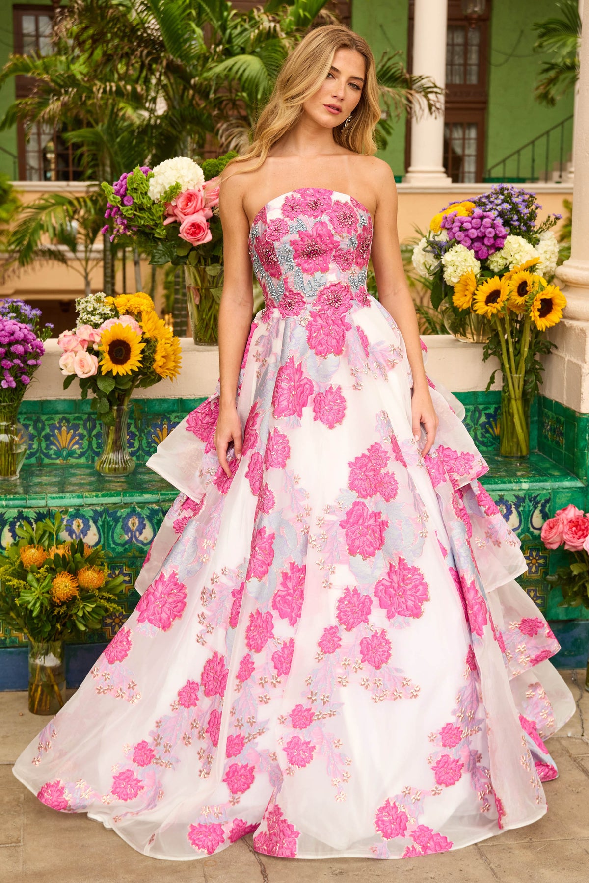 This dreamy floral ballgown, Ava Presley 42292, captures attention with its tiered layers and intricate floral embroidery. Designed with a strapless sweetheart neckline and voluminous multi-tiered skirt, it brings elegance and grandeur to any special occasion. The structured bodice features delicate embellishments, while the ruffled back adds drama to every step.