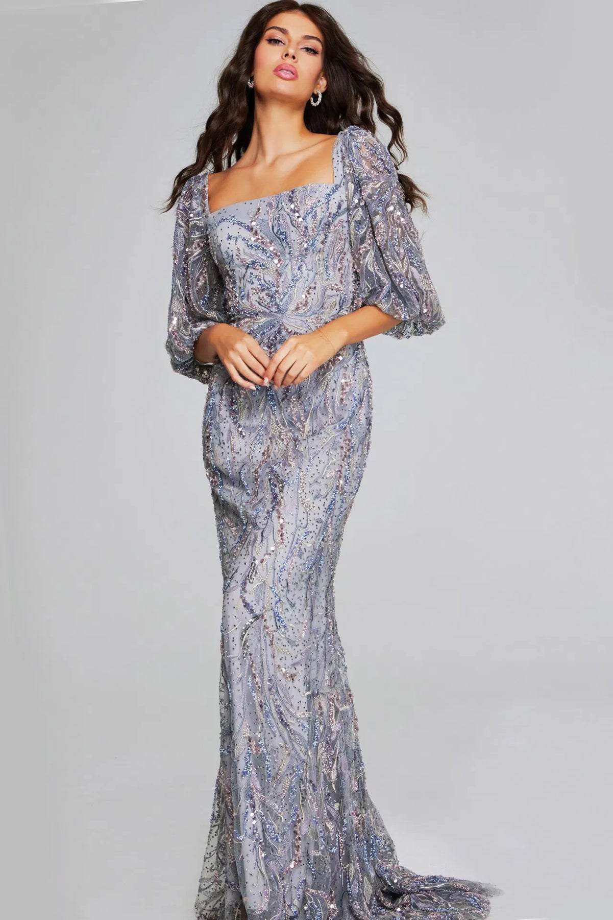 Become the center of attention with the Jovani 38110 Dress. This elegant grey sequin gown features puff sleeves that add a touch of glamour. Perfect for any special occasion, this dress will make you shine.