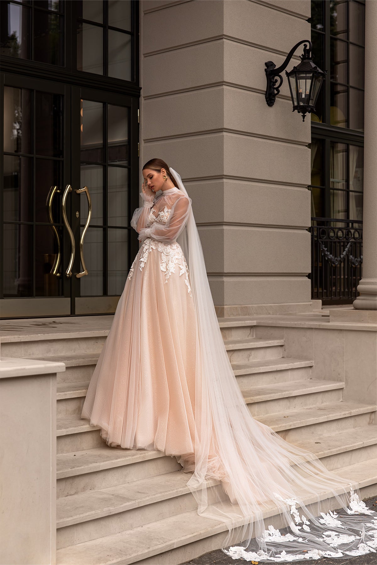 The Maria Anette 5328 Dress is a daring bridal gown featuring a romantic sweetheart neckline layered with an illusion high neckline. Sheer bishop sleeves add volume and elegance, while the intricately embroidered bodice is adorned with metallic floral appliqués, creating a bold and unforgettable look for the fearless bride.