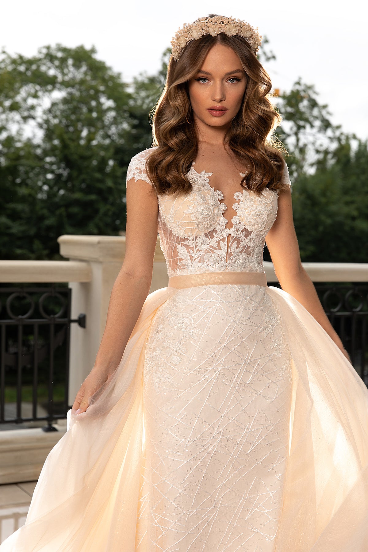 The Maria Anette 5331 Dress is a daring bridal gown featuring a bold V neckline and short sleeves adorned with delicate floral appliqués. Its tight silhouette is complemented by a flowy detachable overskirt, adding versatility and drama. An open back completes this fearless design, perfect for the bride who wants to make a striking and unforgettable statement.