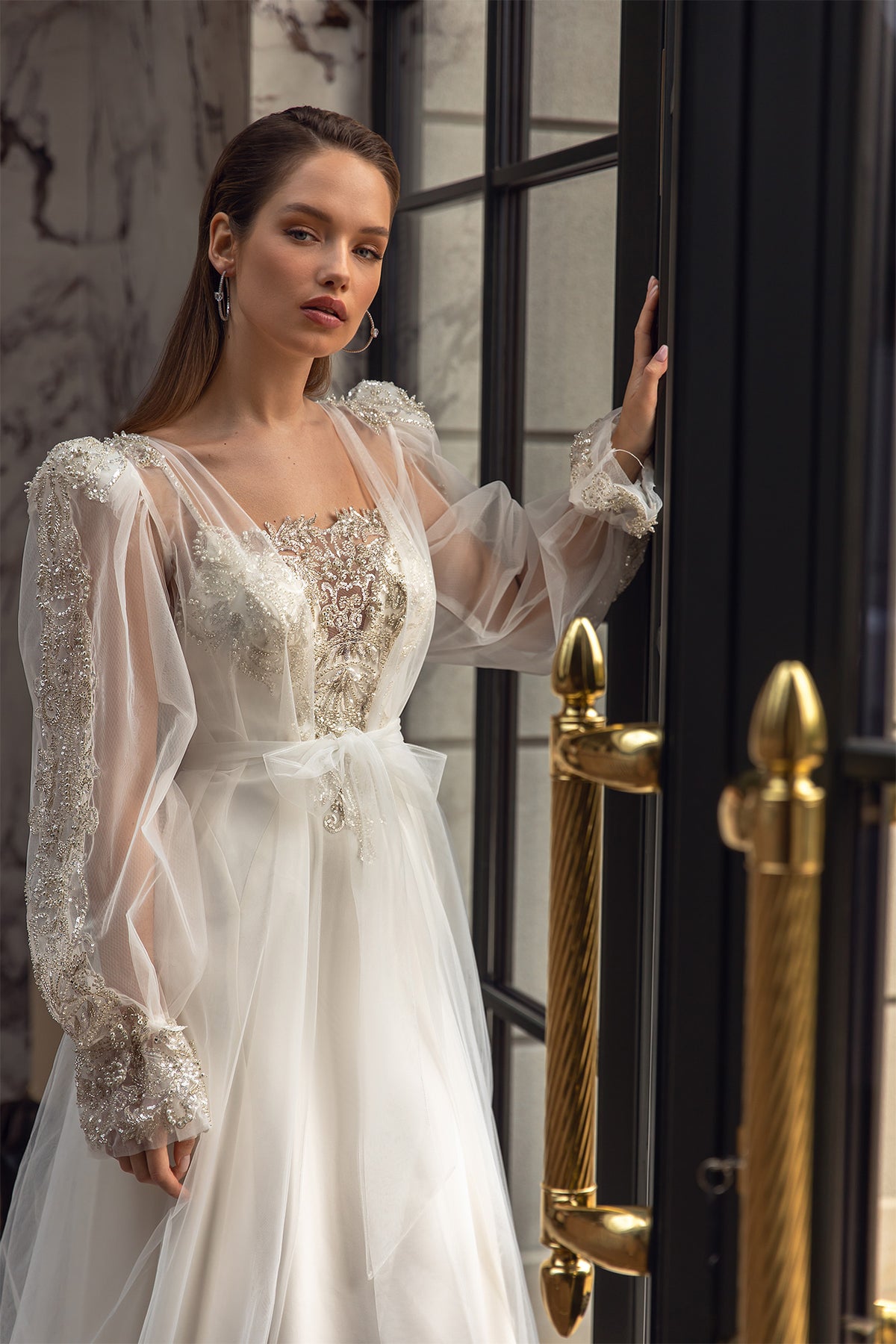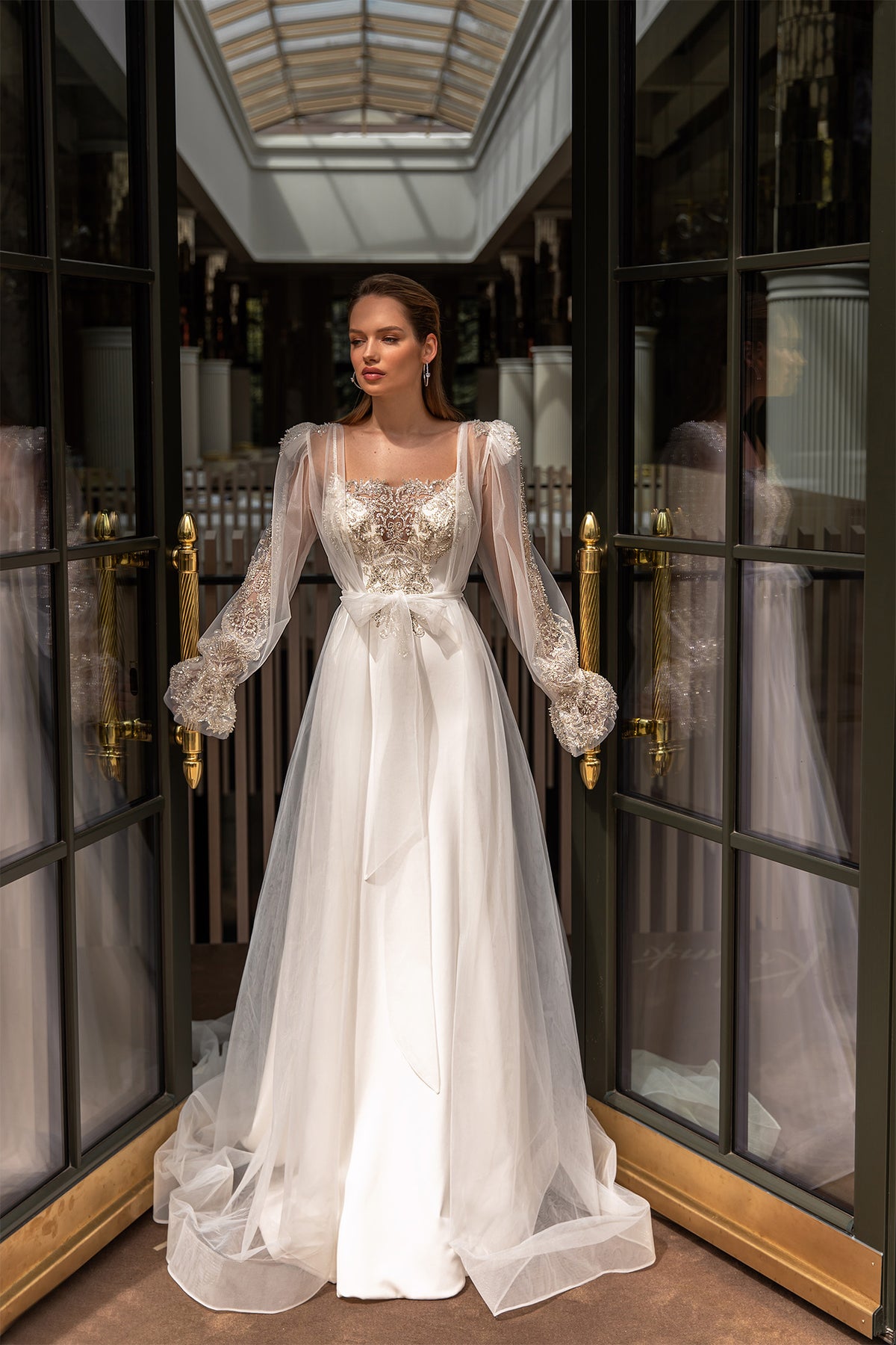 The Maria Anette 5340 Dress is a daring bridal gown featuring a square neckline framed by sheer tulle panels and an intricately embroidered, beaded bodice. Sheer bishop sleeves add volume and elegance, while the flowing A-line skirt with a sheer tulle overlay creates a graceful silhouette. A delicate bow waist tie adds a bold yet feminine finishing touch.