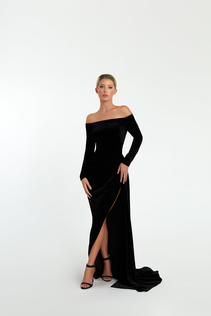 This NICOLE BAKTI 7042 dress exudes elegance with its off the shoulder design and deep slit that flatters your legs. Made of high-quality material, it offers both style and comfort. Perfect for making a statement at any gathering.