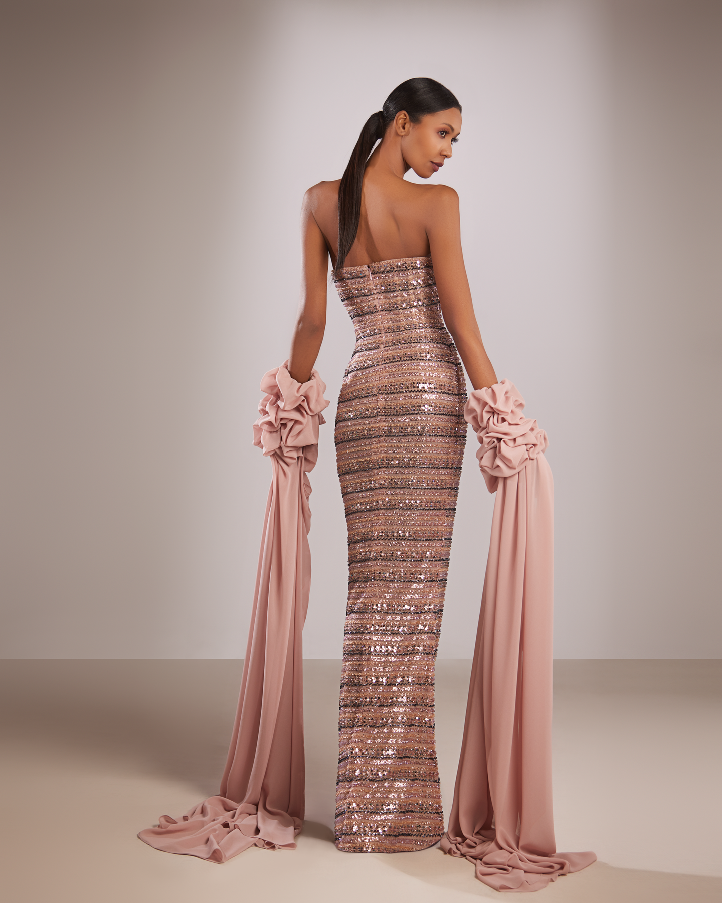 The Reverie Couture FW208 Dress is a stunning pink gown with a fitted silhouette. Featuring a strapless design and horizontal beading, it exudes elegance and sophistication. The detachable chiffon drape with ruffled cuffs adds an extra touch of glamour to this beautiful dress. Perfect for formal events, this gown will make you stand out with its timeless and chic design.