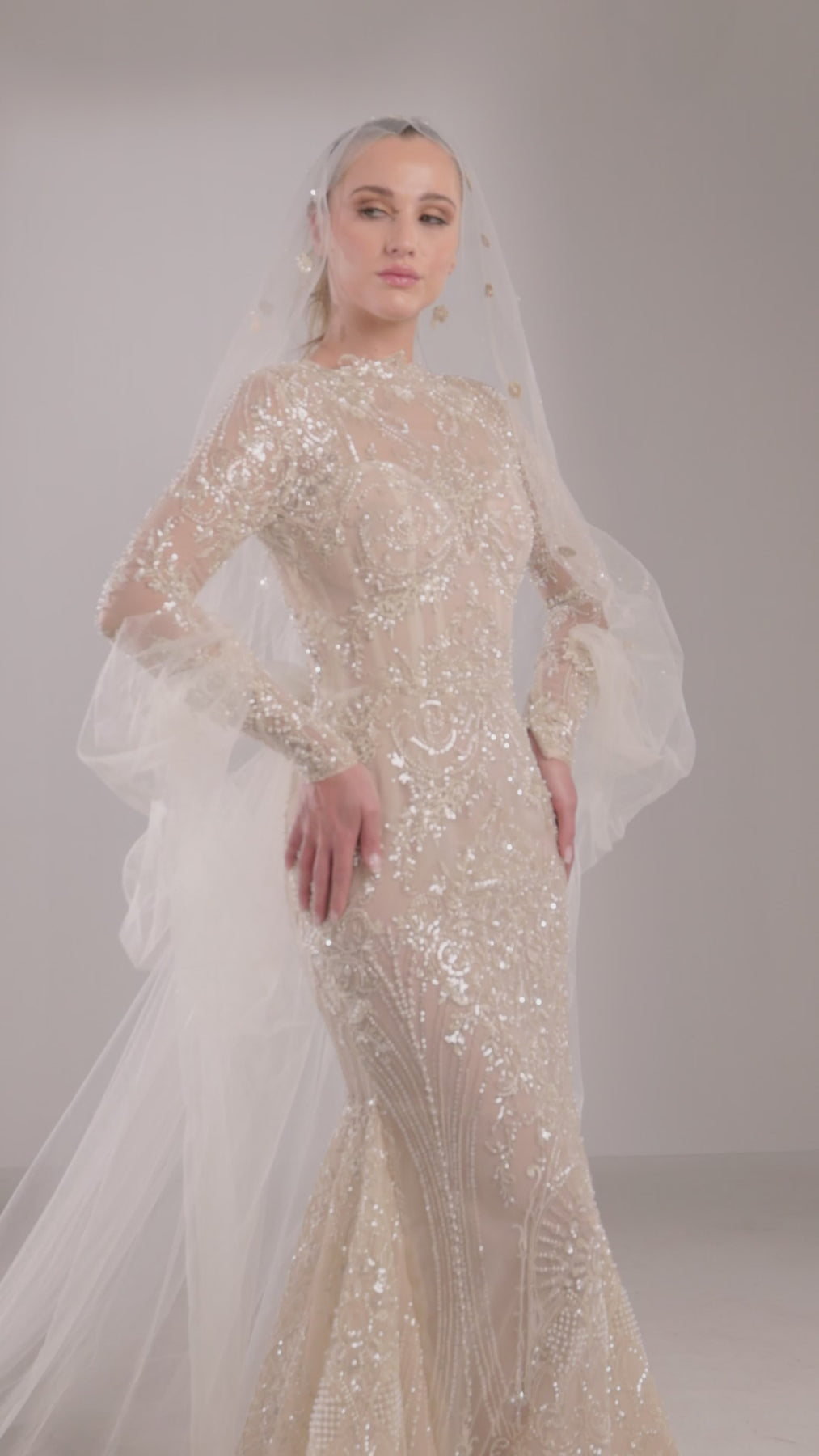 This long-sleeve champagne bridal gown is the epitome of elegance. Its high neckline and fitted silhouette are detailed with delicate threadwork and sparkling beading, giving it a luxurious touch. With a sheer beaded veil included, this dress will make any bride feel like royalty on her special day.