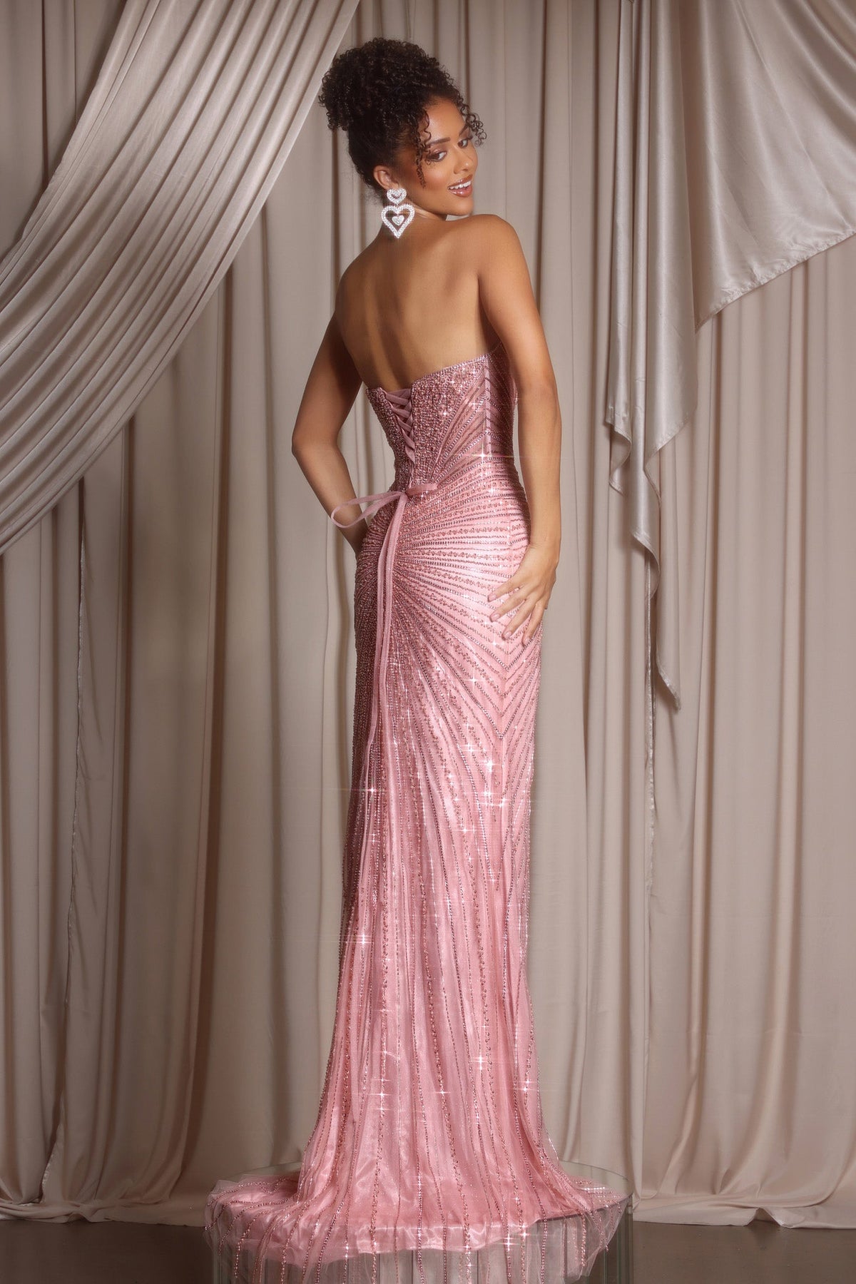 PS26012 is designed to shimmer from every angle, featuring a plunging neckline and sculpted bodice. Intricate bead embellishments trace the silhouette, adding radiant sparkle and dimension. A daring front slit brings a touch of allure and graceful movement, while the floor-length skirt flows beautifully for an elegant finish.