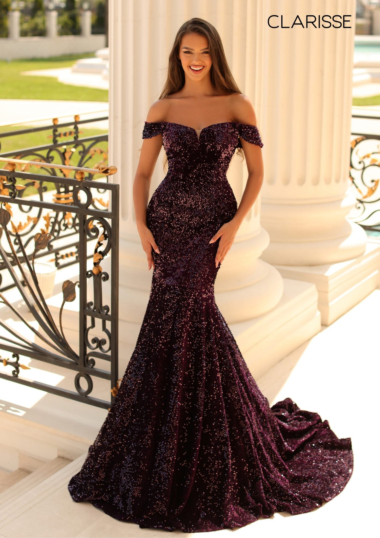 Clarisse Designs 810535 is a stunning mermaid evening gown with velvet stretch sequins, off the shoulder sweetheart neckline with lace up back and sweeping train.