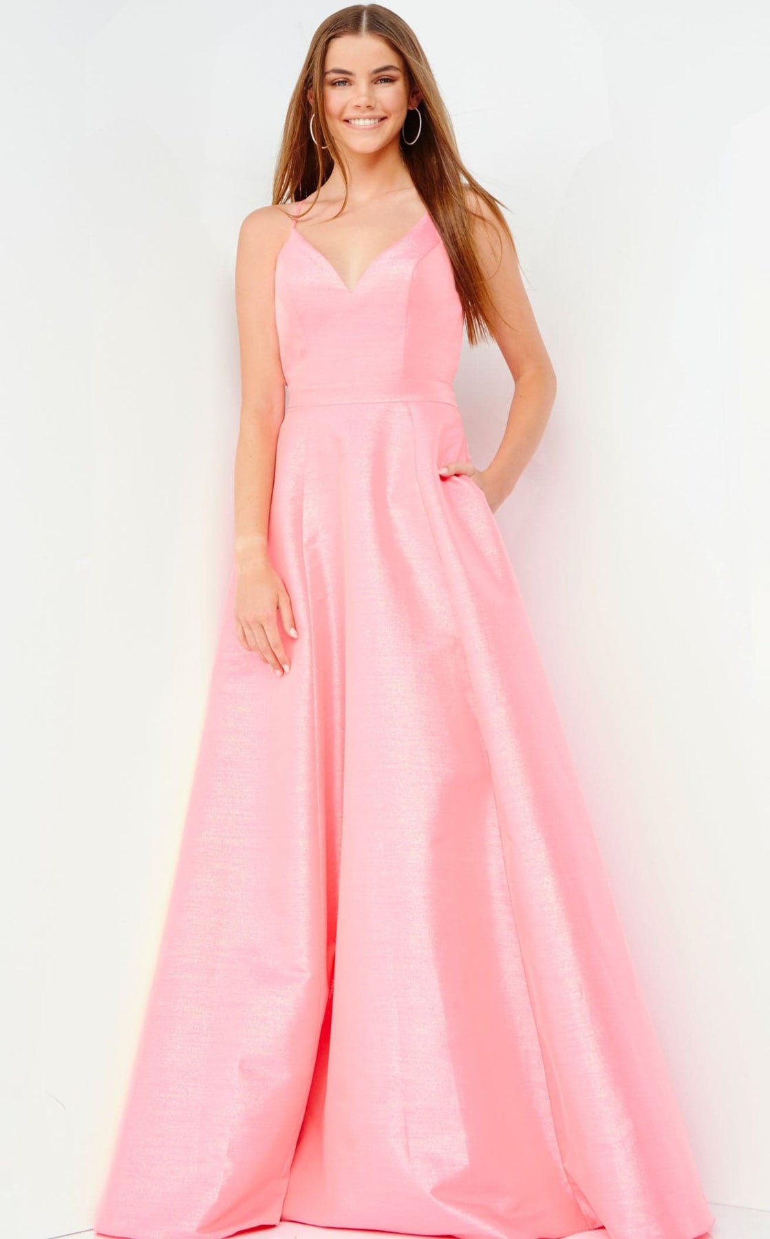 Slip into this finely contoured outfit by JVN and stun everyone that watches you. Flaunting a sleeveless design with a low V-neckline and an open strappy back, the dress promises to boost your confidence. It flows into a cinched waistline and an A-line skirt with pockets. The dress ends with a sweep train and gives you a dramatic feeling.