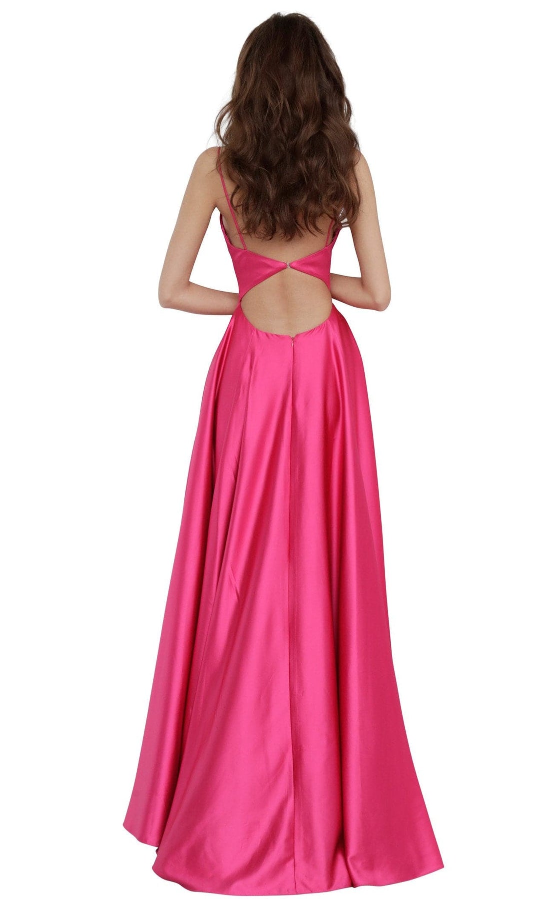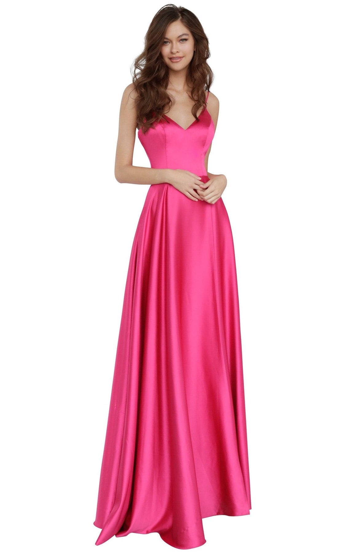 Make a lasting impression in this shimmering evening gown by JVN by Jovani. The fitted dress is tailored with a plunging V-neckline supported by thin spaghetti straps. The hugging bodice flows down to an A-line skirt design with a floor-length hemline that offers a diva appeal to your party look.
