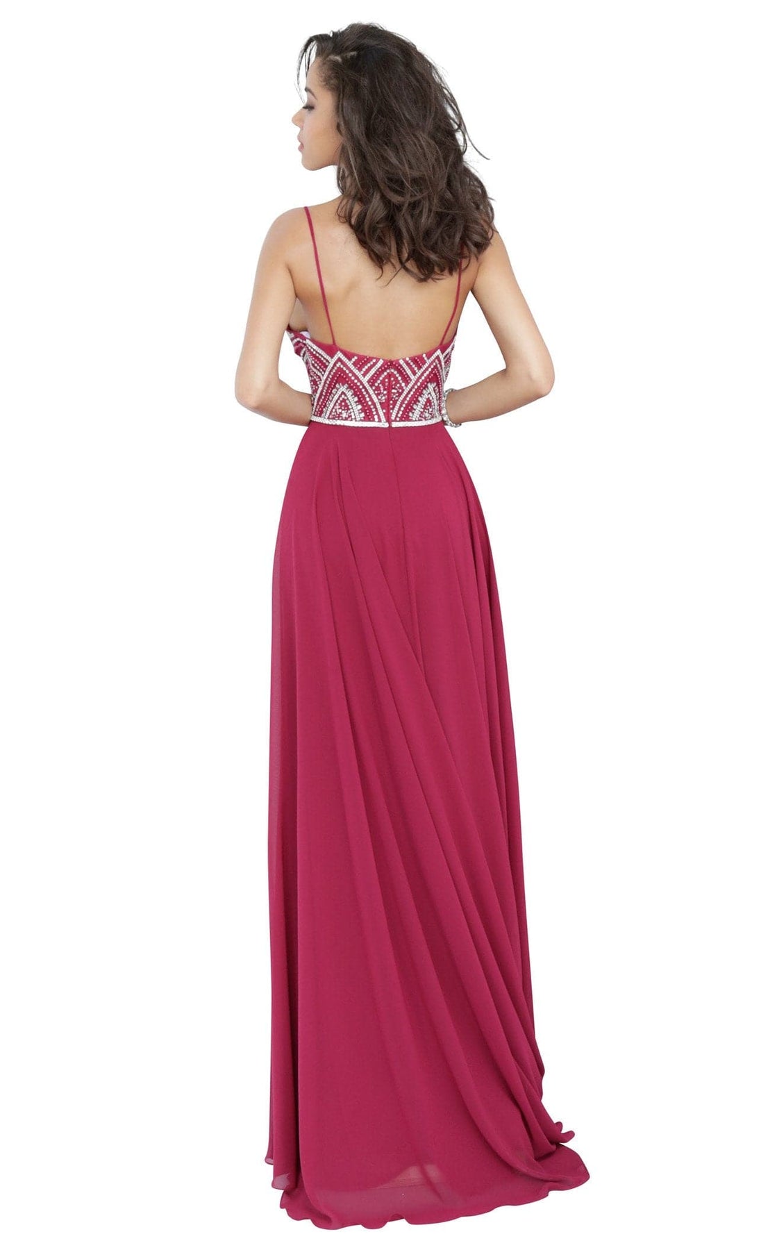 Look marvellous in this perfectly designed dress by JVN by Jovani. The evening gown features a V-neckline supported by thin spaghetti straps that open to a low-cut back. Detailed with intricate stone accents, the fitted bodice glides down through a fitted waist to an A-line silhouette skirt with floor-length hemline that ends with a sweep train.