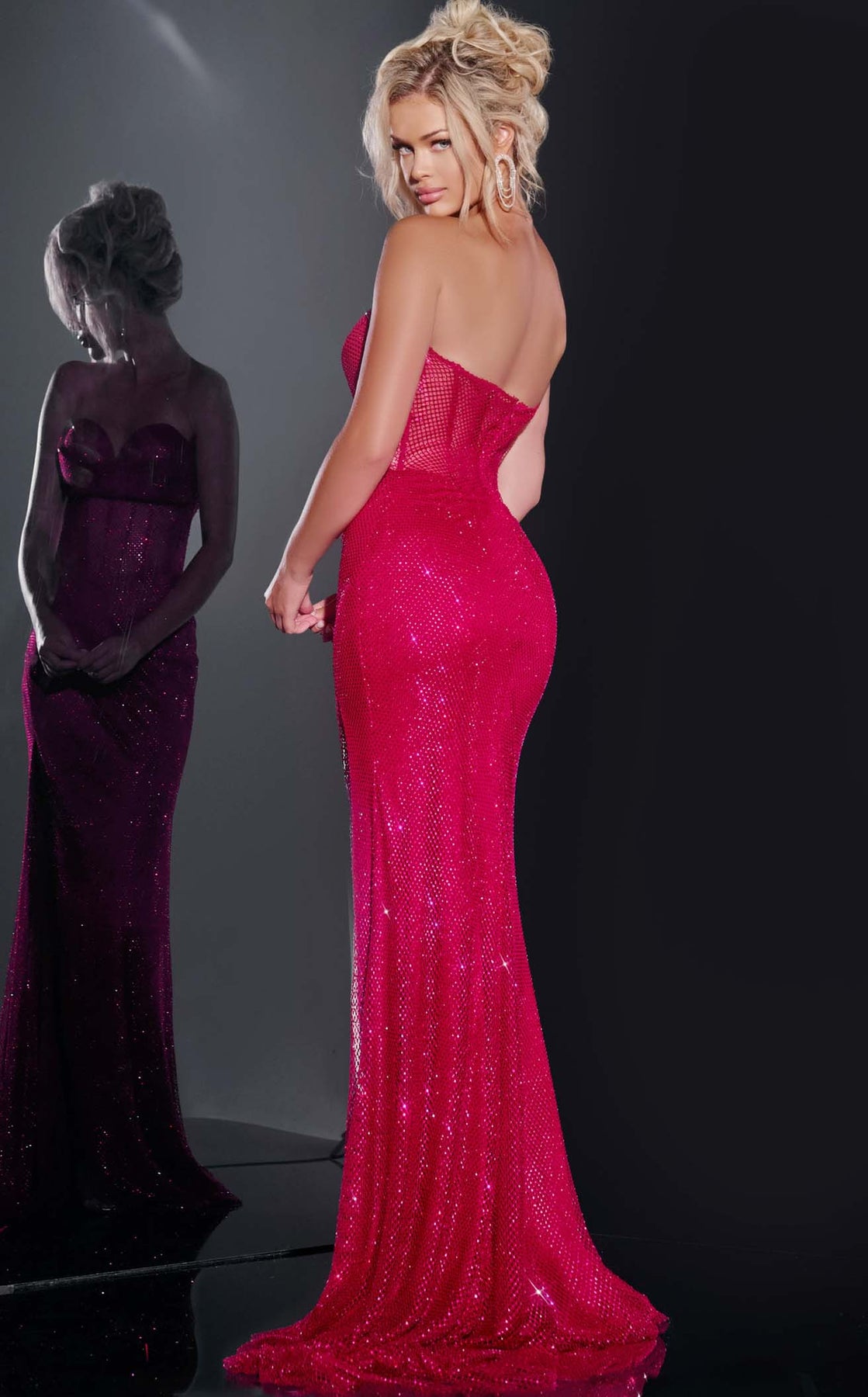 Elevate your evening look with the captivating Jovani 36684 dress. Its sheer, sequin-adorned bodice adds a touch of sparkle to your appearance, while the fitted silhouette accentuates your curves. Featuring a bold high slit, this floor-length gown exudes sophistication and allure, making it the perfect choice for any upscale event. Make a statement with the Jovani 36684 gown!