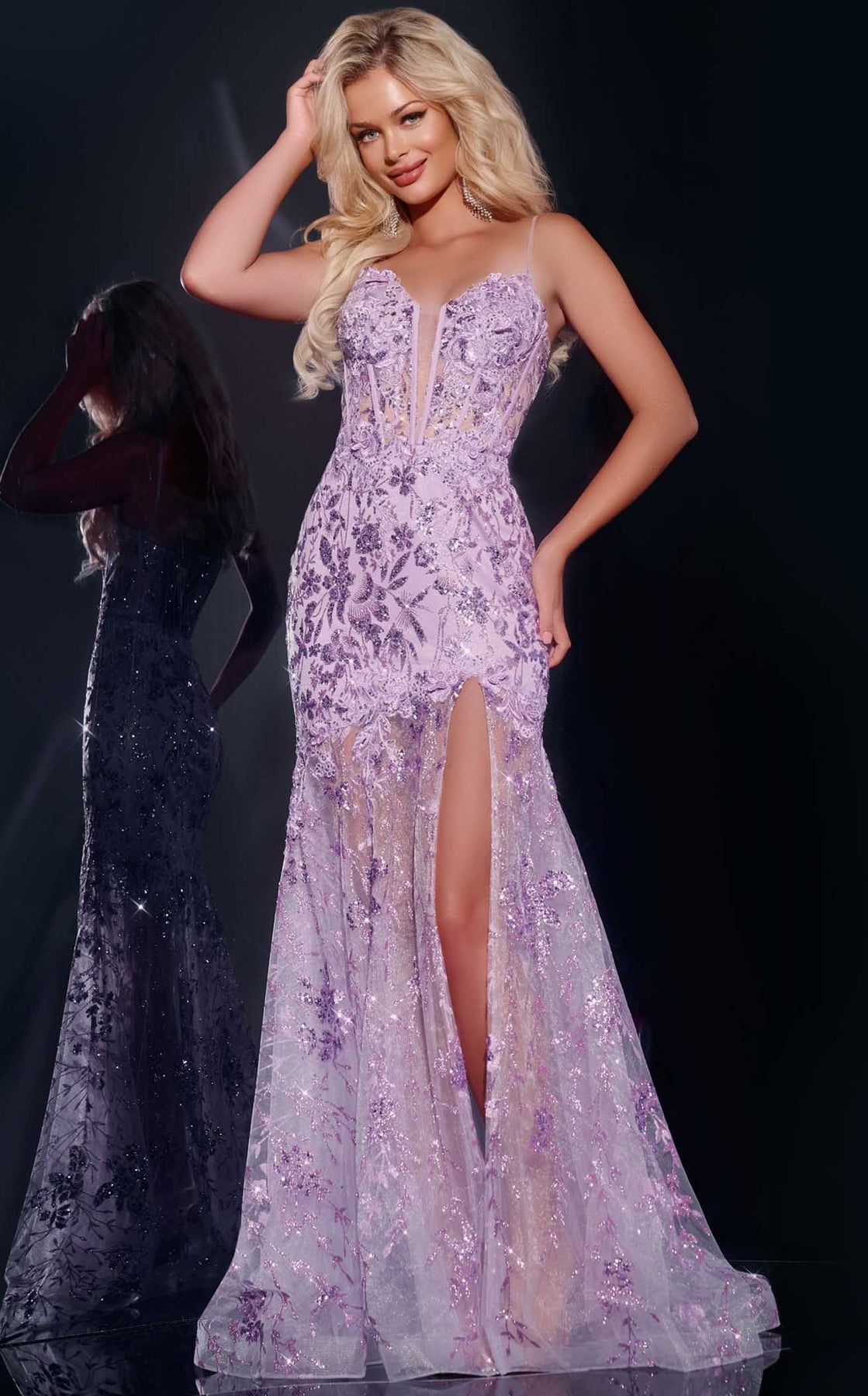 The Jovani 42203 Dress offers the perfect balance of romance and drama. With delicate spaghetti straps and a plunging neckline, this gown creates an alluring silhouette that is sure to turn heads. The high slit adds a bold touch, while intricate sequin details catch the light beautifully. Make a statement in this dress!