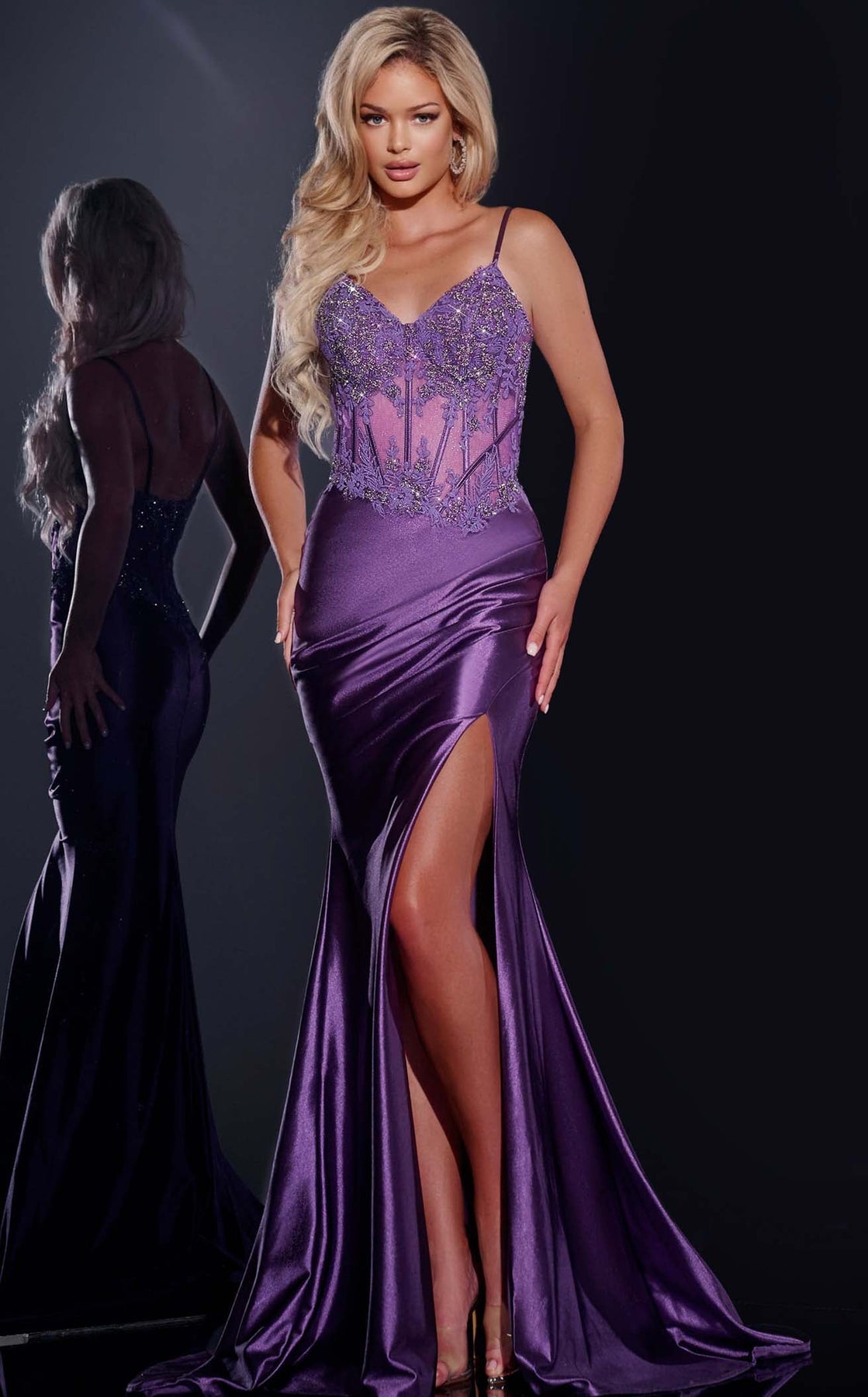 Indulge in luxury with the Jovani 42259 Dress. The beaded bodice adds a glamorous sparkle to this satin gown, while the tailored lines and V-neckline exude elegance. With a high slit and sleeveless design, this gown showcases the shoulders and flatters the figure for a confident and unforgettable entrance.