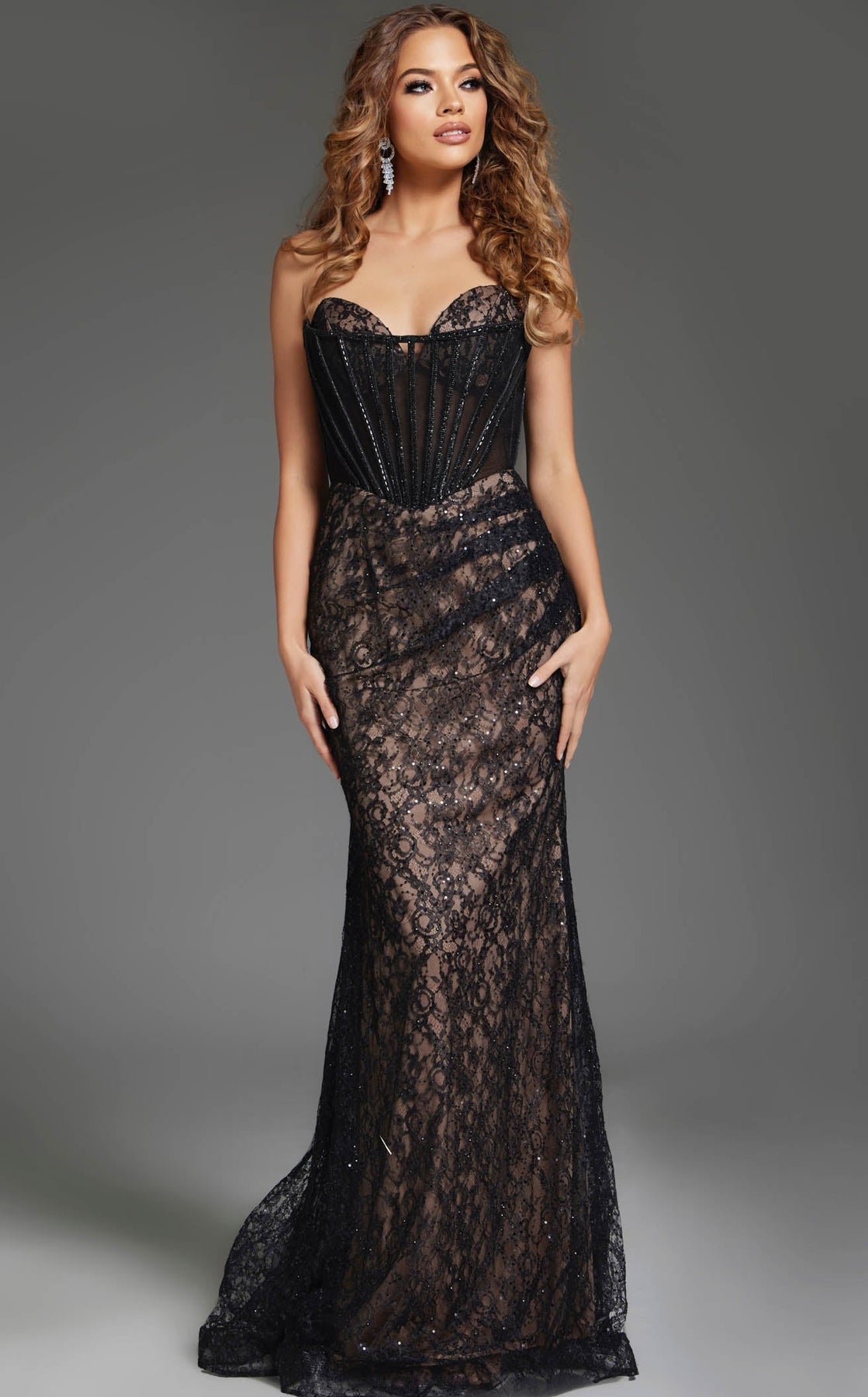 Be the star of the night in the Jovani 44609 Dress! This stunning gown features a structured corset bodice adorned with intricate lace and sparkling sequins, creating a mesmerizing and elegant look. The floor-length sheath silhouette drapes beautifully and is finished with a dramatic train, making a lasting impression. With a secure back zipper closure, this dress is perfect for any formal event, ensuring you shine with style and grace.