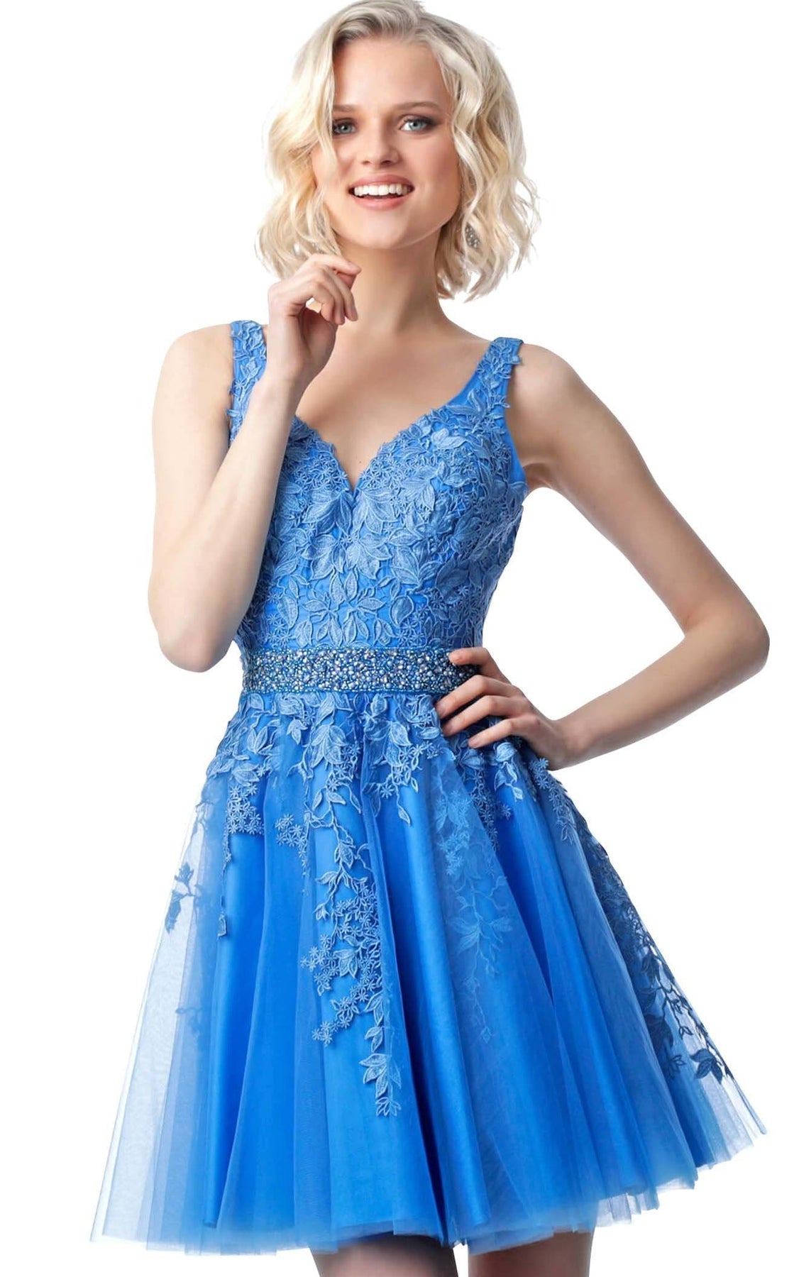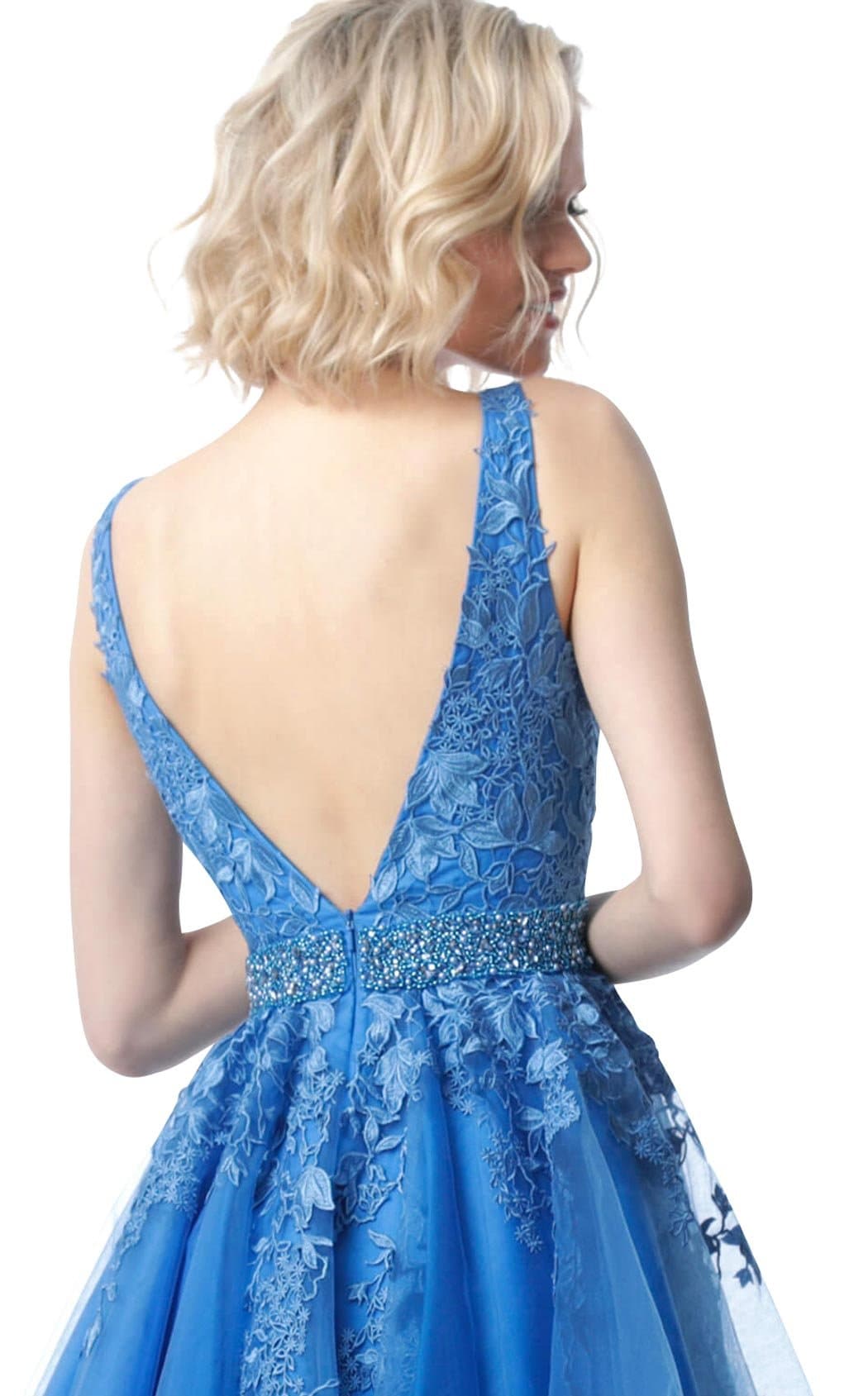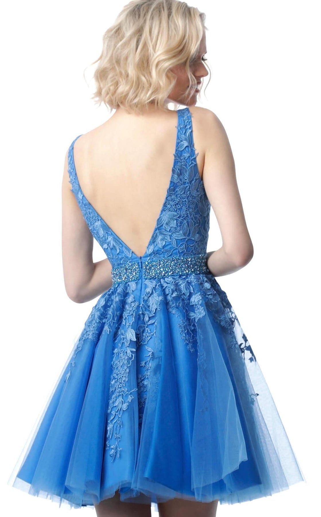 Feel beautiful when you walk into the party wearing this delightful creation from JVN By Jovani. This sleeveless dress showcases a V-neckline with low-cut V-back. Embellished with flattering lace appliques, this party dress is accented with an embellished belt across the waistline to add a perfect amount of sparkle to your look. This Jovani creation is complete with a mid-thigh tulle A-line skirt.
