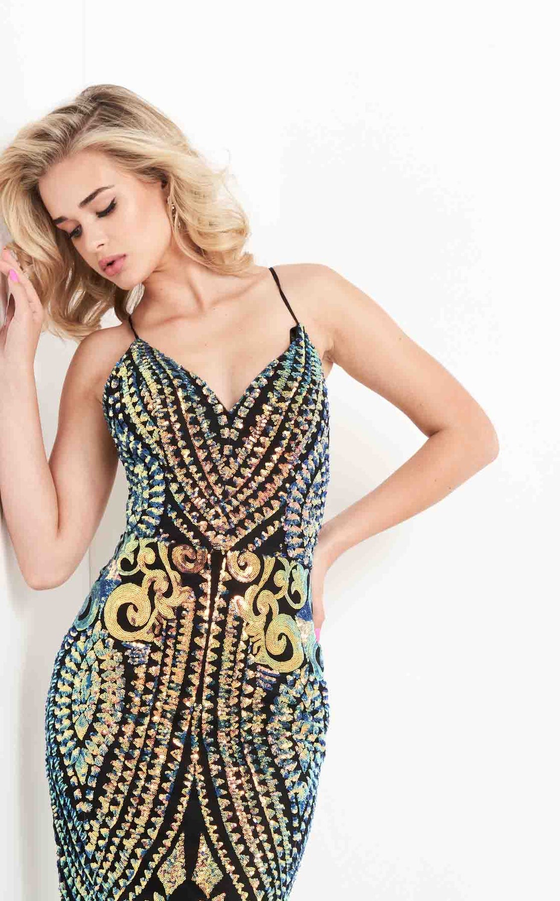 Enter the gathering and dazzle like a diva in this elegant long dress from JVN. Embellished with sequins, this fitted outfit features a V-neckline supported with spaghetti straps. The open back is styled with lace-up detail. The skirt that flows into trumpet silhouette in full length with a horsehair hem is finished with a brush train.