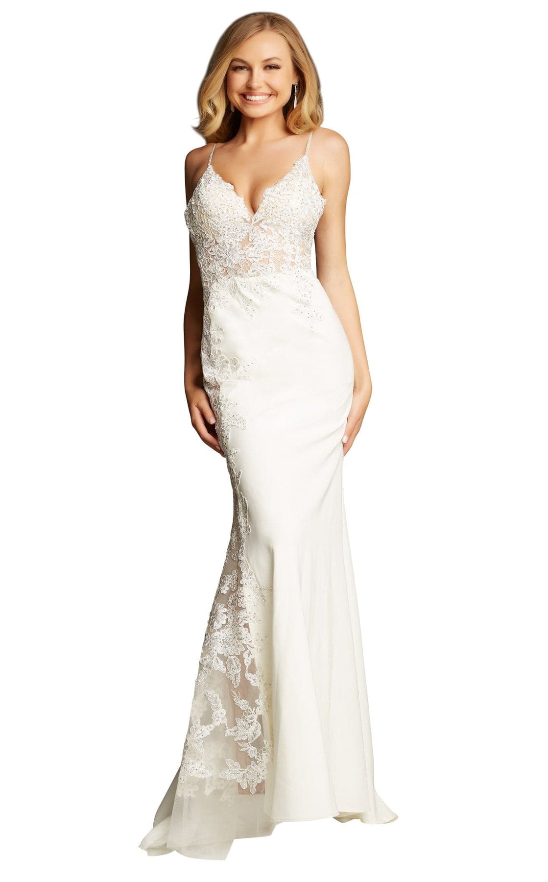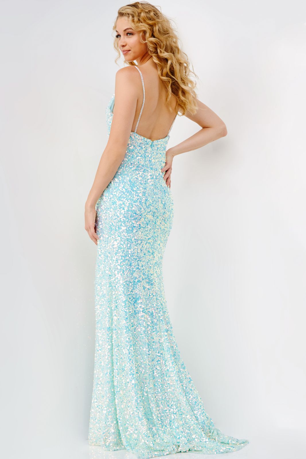 Feel beautiful when you walk into the party wearing this charming long dress by JVN. This top to bottom sequin embroidered dress has a fitted sleeveless bodice with a plunged V-cut neckline supported by spaghetti straps and a low-rise back. The skirt, with its form-fitted silhouette, is finished with a thigh-high slit and a sweep train.