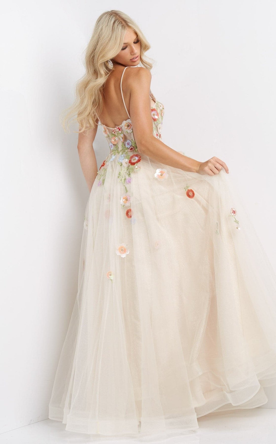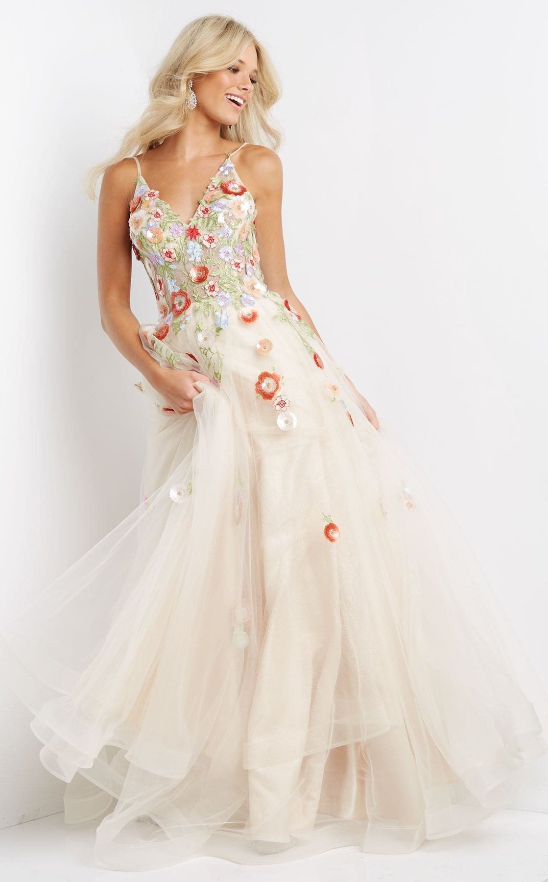 Add glitz and glamor to your look with this enchanting long dress by JVN. Featuring a sleeveless bodice with V-neckline and spaghetti straps. The floral appliques on the bodice that stretches to the top skirt add a vibrant look to this outfit. The sheer net over the A-line skirt features a horsehair hem.