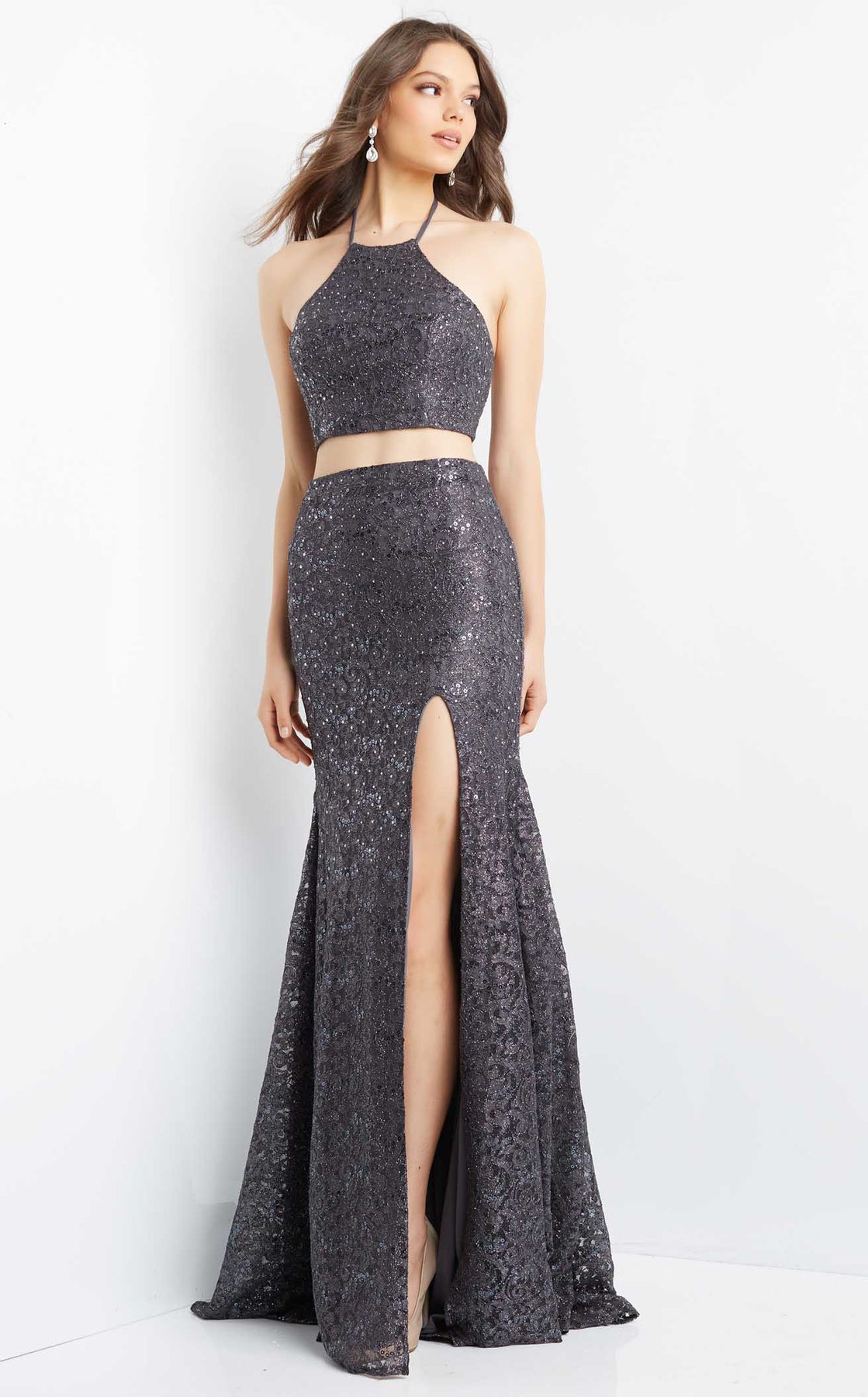 A stylish creation by JVN, this glittering two-piece dress features an attractive sleeveless crop top with a high halter neckline. The crop top is supported by spaghetti straps that reveal a criss-cross open back adding a flirty effect to the outfit. Matching glitter detailing highlights your curves in the fitted silhouette skirt that flows to the floor-length enhanced with a high slit.