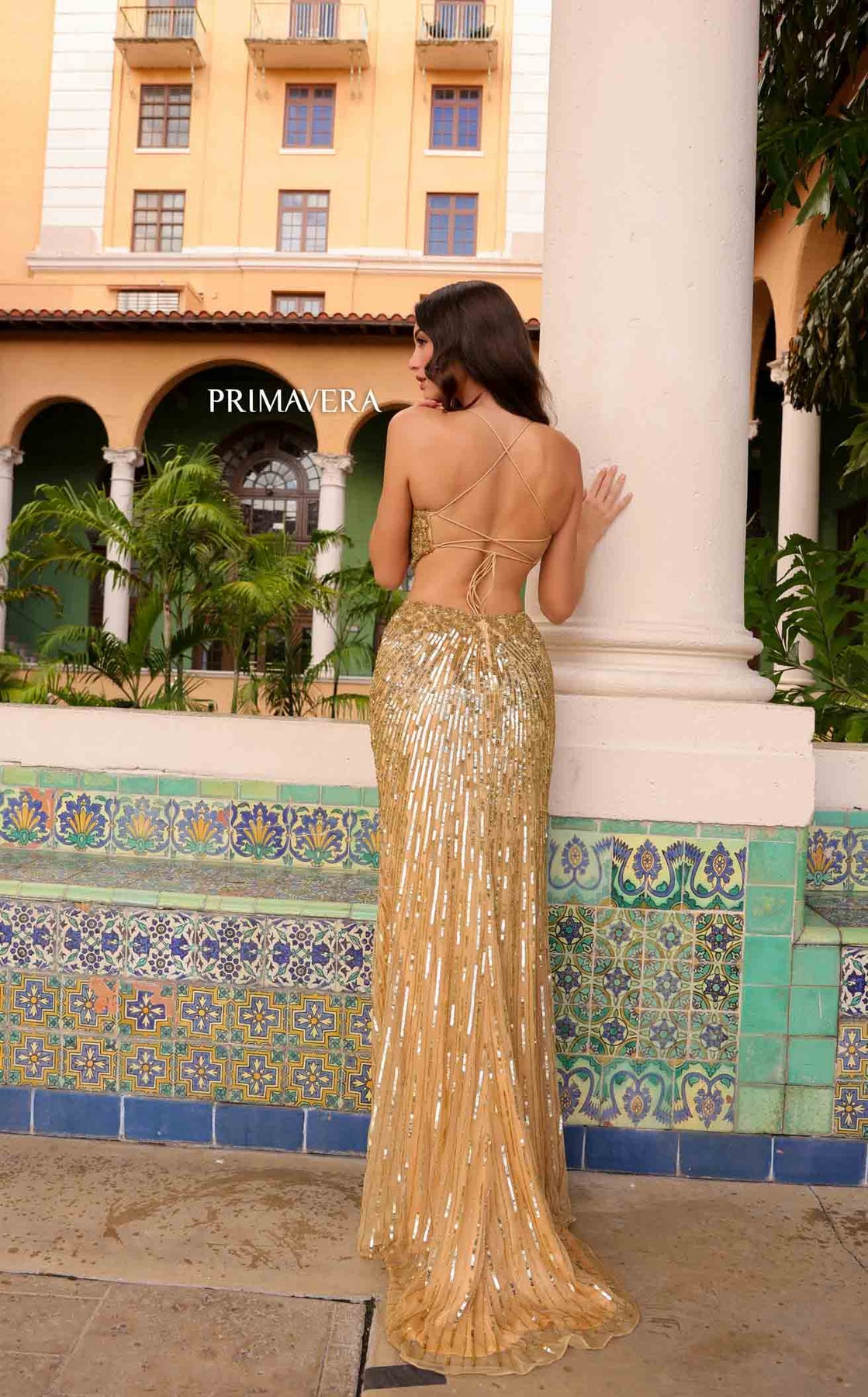 Get ready to steal the spotlight in our Primavera 4125 Dress! Perfect for prom or an evening out, this elegant, sleeveless dress features a strapped shoulder and specially designed waist for a confident and unique style. The open back and slit add a touch of playfulness to this beautiful, beaded long dress.