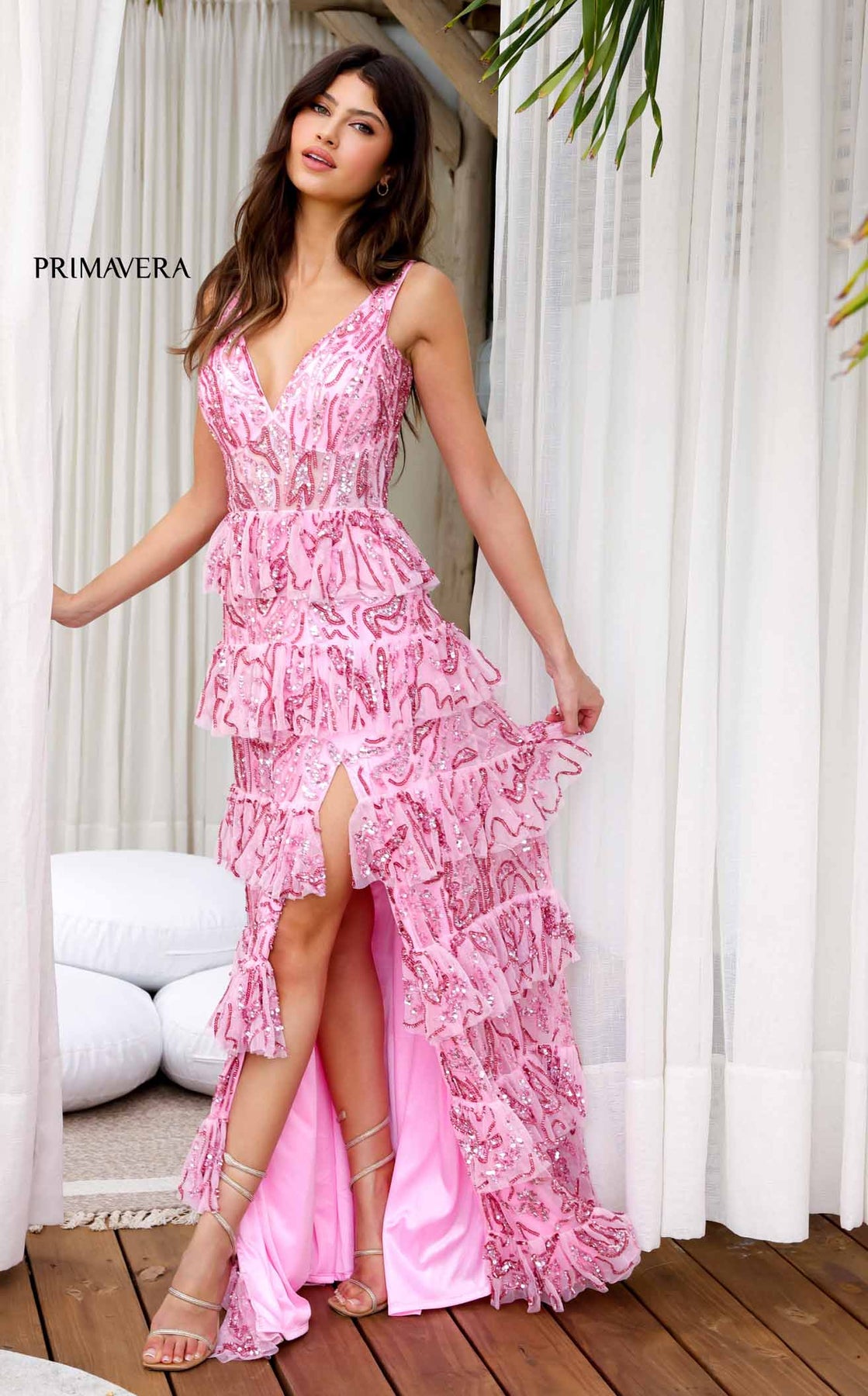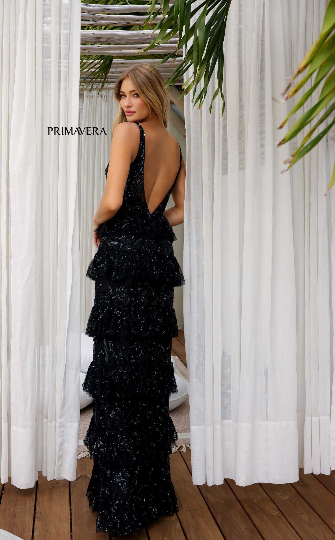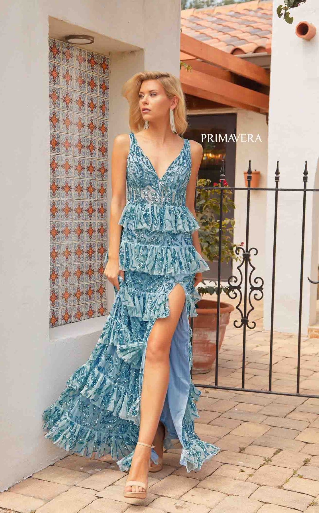 Enhance your evening with the stunning Primavera 4295 Dress. This beaded, layered dress features a unique and elegant special design with a v neckline, high slit, and open back. You'll surely turn heads and feel amazing in this beautiful and embellished dress.