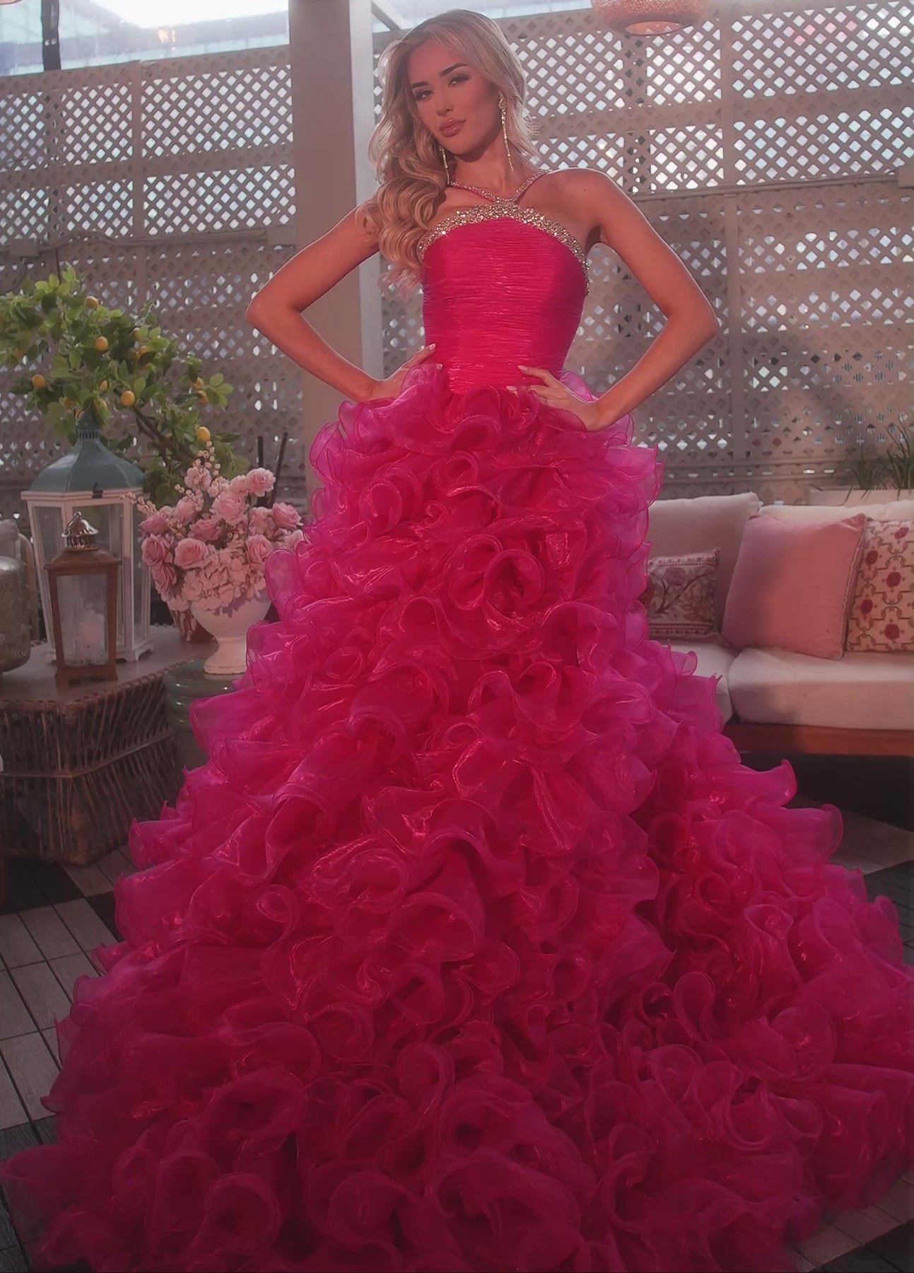 Turn every head in style 50365—a high-glam gown with dramatic layers of ruffled organza that cascade into a voluminous train. The fitted bodice features crystal beading and a chic asymmetric strap, while the front slit adds a modern twist. Available in crisp White for timeless beauty or bold Fuchsia for fearless flair—perfect for pageants, performances, or showstopping entrances.
