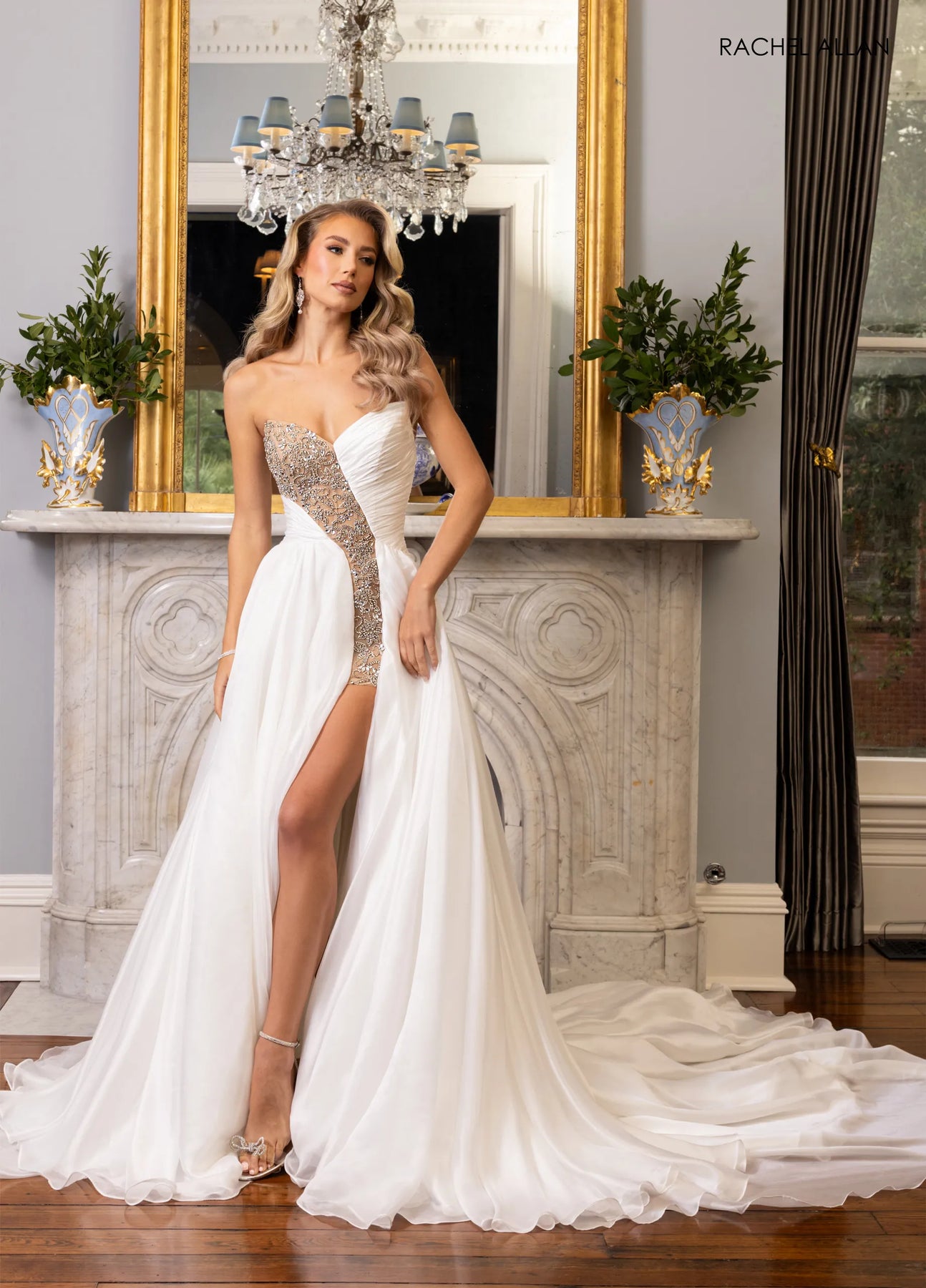 Rachel Allan 50405 Make a statement in this show-stopping shimmer chiffon gown that commands attention from every angle. The sculpted sweetheart neckline pairs beautifully with an intricate crystal-beaded illusion cutout that adorns the bodice with sparkling elegance. A daring high slit keeps things exciting, while cascading layers of tulle build into a dramatic train fit for royalty. Available in rich crimson, pristine white, or soft powder blue nudeāthis dress is your secret weapon for pageants, galas, and those unforgettable moments under the spotlight.