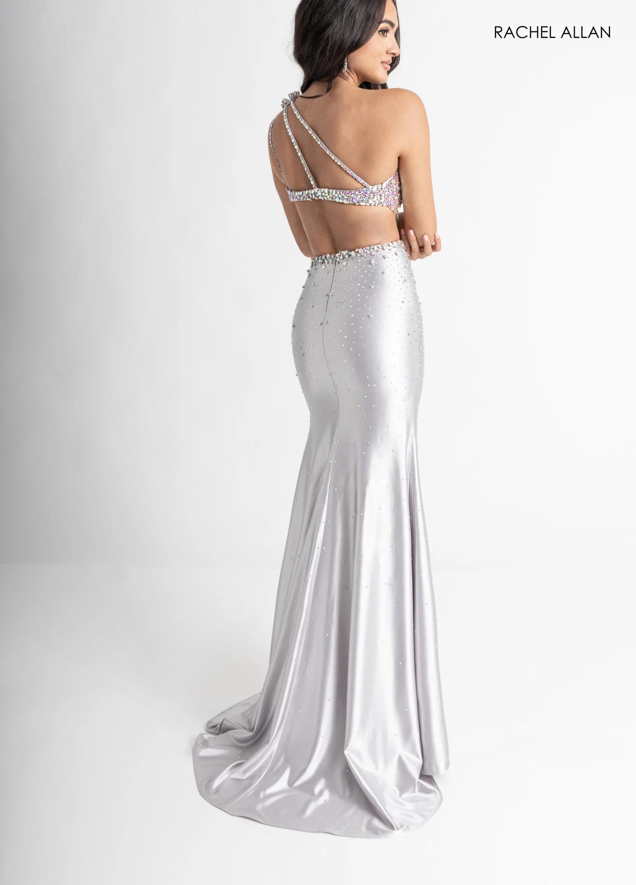 Embrace pure glamour with Style 70943, a show-stopping gown designed to turn heads. Crafted from luxurious satin jersey and adorned with sparkling crystals, this dress features a sophisticated wrap neckline and strategically placed cutouts that exude confidence. The sleek silhouette is enhanced by a thigh-high slit and daring open back, creating an unforgettable statement piece. Perfect for those moments when you want to feel absolutely radiant and commanding in the room.