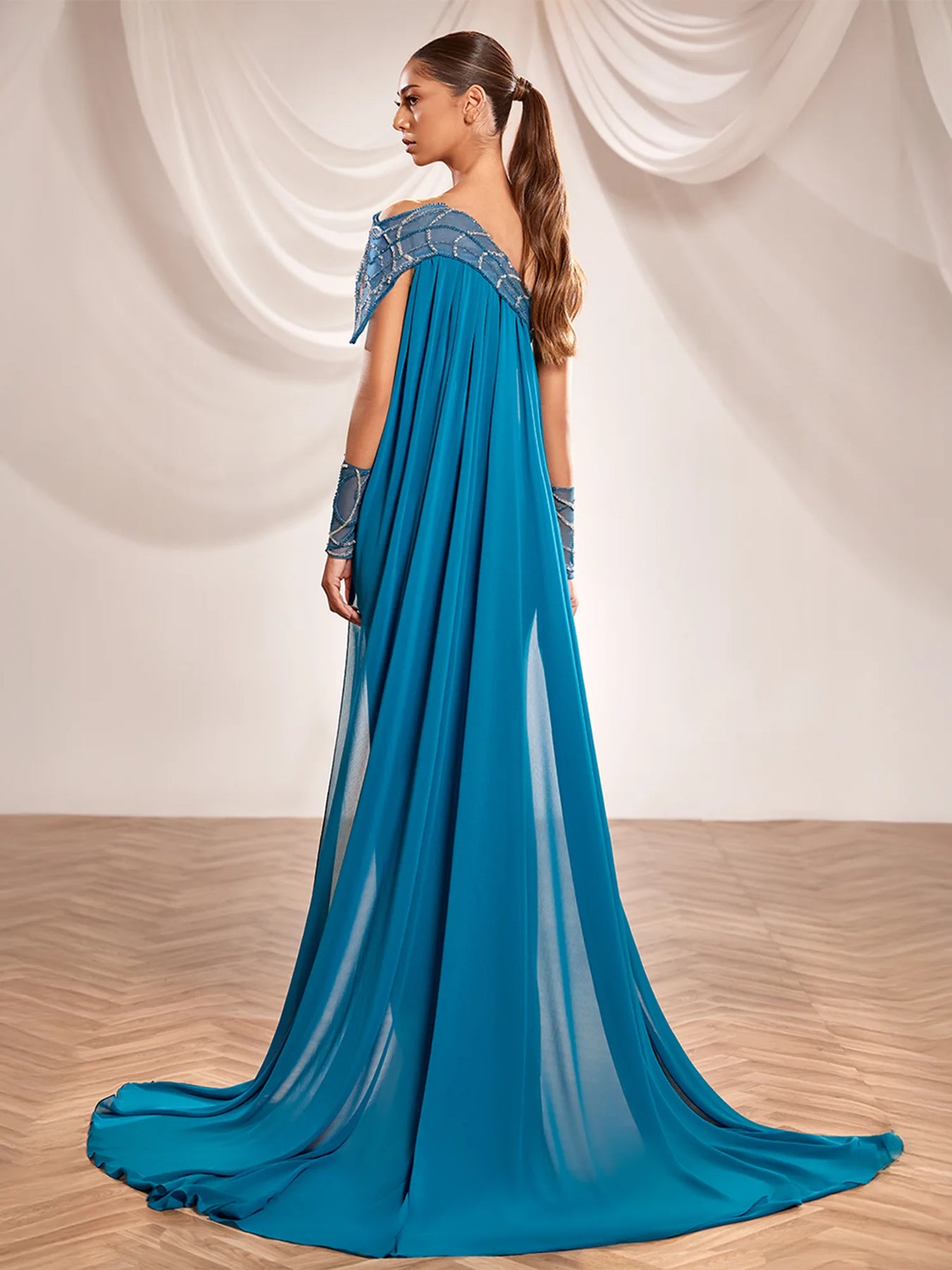 Slip into sophistication with the Reverie Couture SS245—a stunning one-shoulder fitted gown in mesmerizing teal. This show-stopping piece hugs your curves in all the right ways, creating an effortlessly chic silhouette that commands attention. Perfect for galas, weddings, or any occasion where you want to turn heads, this dress transforms you into the main event. The asymmetrical neckline adds a touch of modern flair, while the tailored fit ensures you'll feel as fabulous as you look. Prepare for compliments.