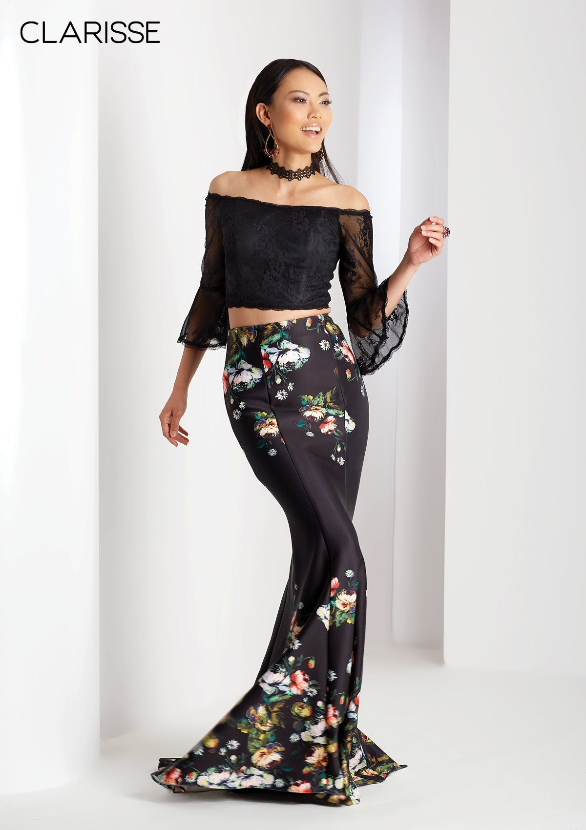 Two piece fit and flare dress with off the shoulder bell sleeve lace crop top and floral print knit skirt.