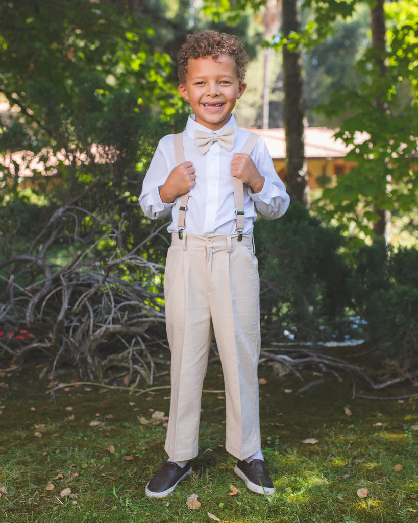 Introduce your little one to timeless elegance with this charming Barn Wedding Set in Safari Sand. Crafted from 100% linen, this slim-fit ensemble combines comfort with sophisticated style, making it ideal for ring bearers and formal occasions. Whether you're planning a rustic celebration or destination wedding, this versatile set delivers effortless charm. The complete package includes tailored pants, a crisp shirt, suspenders, and a coordinating bow tie—everything needed for a polished, put-together look. Durable linen construction ensures your child stays comfortable throughout the festivities while looking absolutely dapper.