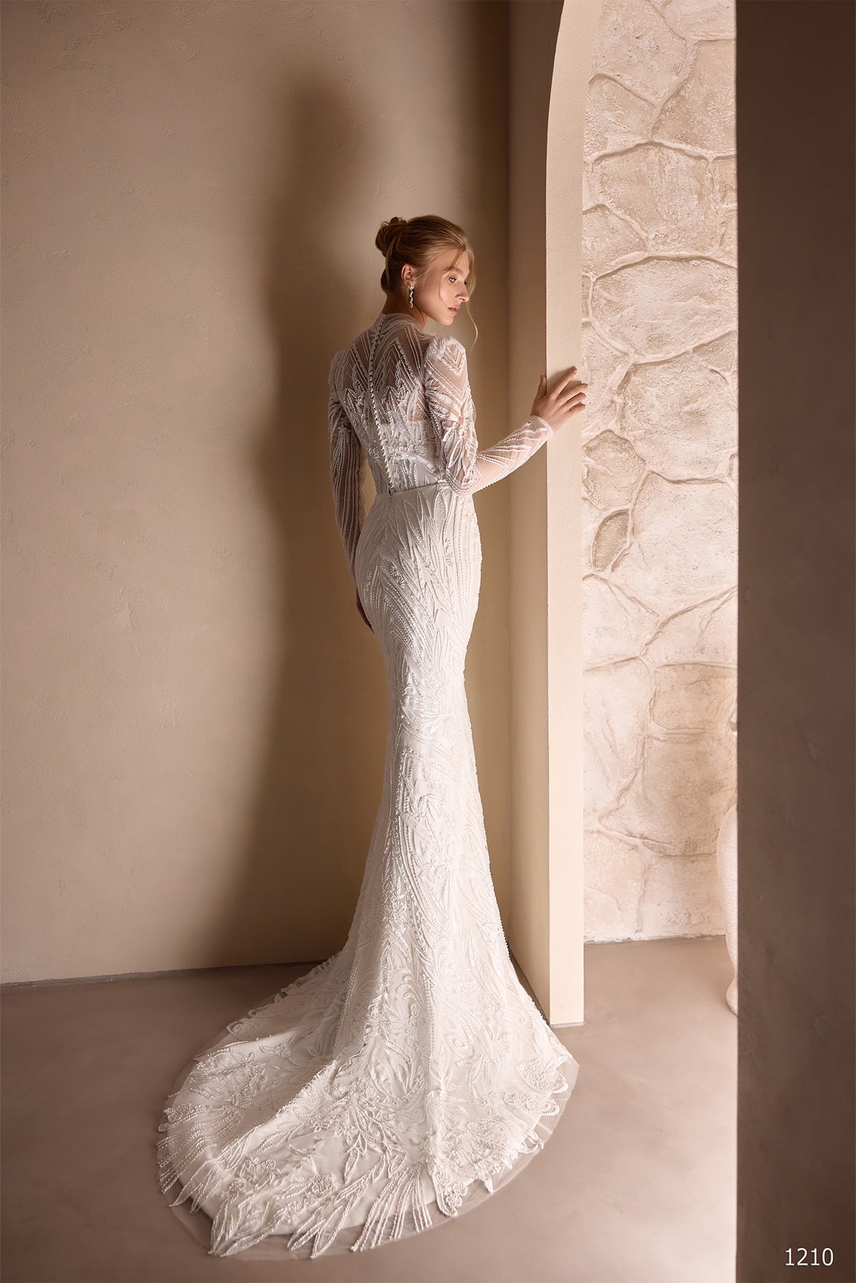 The Vissaria 1210 Dress is an elegant bridal choice featuring a graceful long silhouette with refined long sleeves and a sophisticated high neckline. This timeless design offers modest coverage while maintaining a stunning, romantic aesthetic perfect for your special day. The combination of full-length styling and classic neckline creates a poised, dignified look that celebrates traditional bridal elegance. Whether you're drawn to understated sophistication or prefer coverage that makes you feel confident and beautiful, this dress delivers the polished, memorable appearance every bride deserves. The Vissaria 1210 is designed to help you feel radiant and supported as you walk down the aisle.