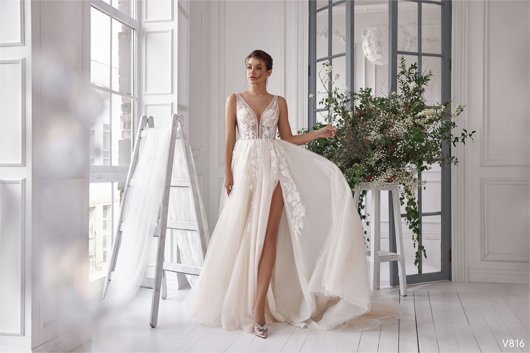 Discover timeless elegance with the Vissaria 816 Dress, a stunning bridal gown designed for the modern bride. This sleeveless masterpiece features a flattering V neckline and delicate straps that frame the shoulders beautifully. The open back creates an alluring focal point, while the high slit adds contemporary flair and movement. Perfect for walking down the aisle or making a statement at your special celebration, this dress combines sophistication with confidence. Crafted for those who embrace both classic beauty and bold style choices.