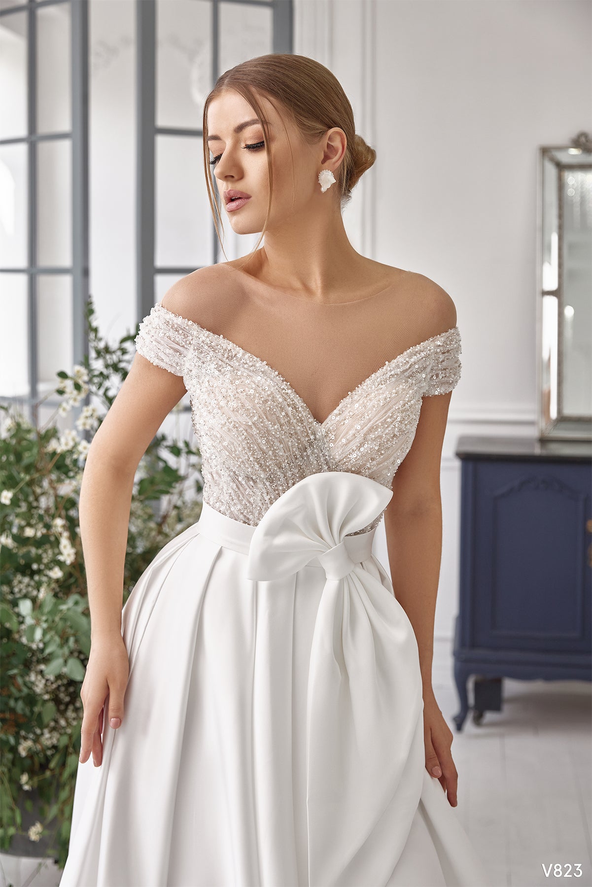 The Vissaria 823 Dress is a breathtaking bridal creation that celebrates your beauty on your wedding day. This sophisticated gown showcases an off-shoulder design with a delicate sweetheart neckline, while the sleeveless cut and open back detail add an element of modern allure. The high slit provides graceful movement and contemporary flair. Crafted with elegance in mind, this dress empowers you to feel radiant, confident, and absolutely stunning as you embrace one of life's most cherished moments.