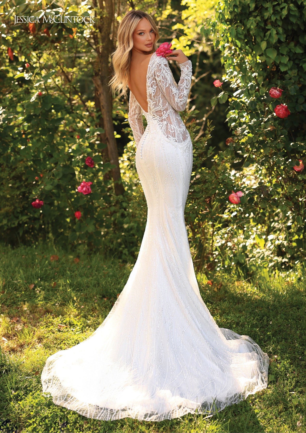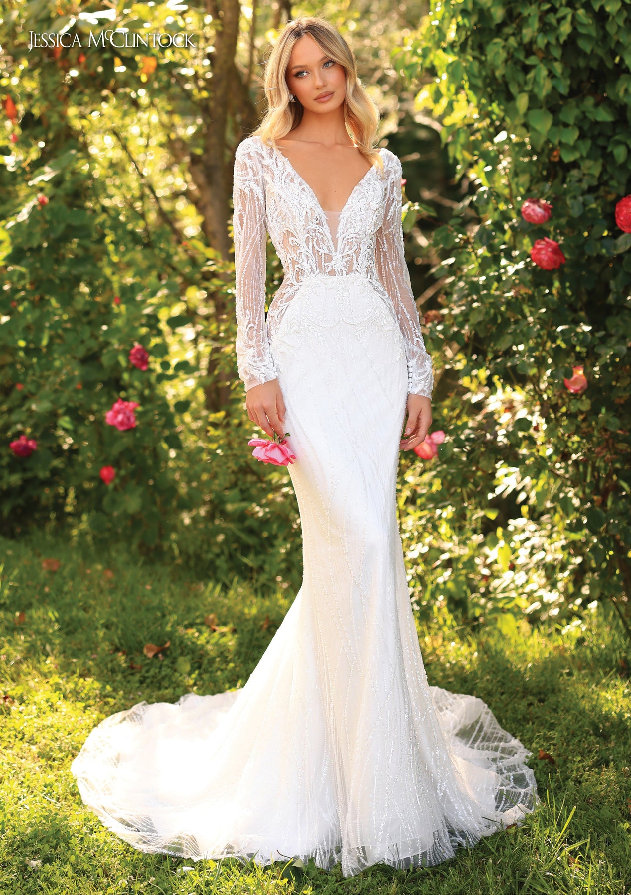 This stunning wedding dress, Style #700460, features a lace beaded bodice that adds a touch of elegance to your special day. The v-neckline and long sleeves create a classic look, while the detachable overskirt allows for versatility in your style. Exude confidence and beauty in this gorgeous dress.