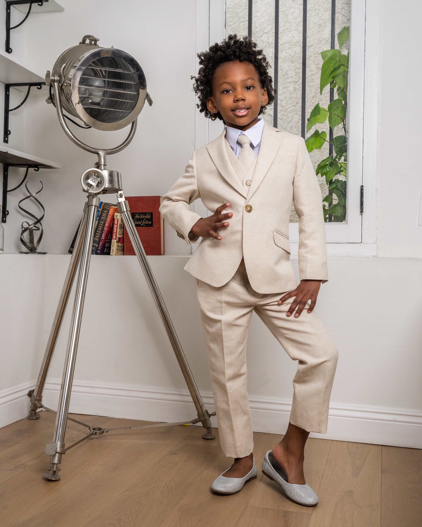 The Oasis Safari Sand Kids suit draws inspiration from the Sahara Desert and exudes both sophistication and vibrancy, making it the perfect choice for Ring-bearers, Weddings or any Formal Occasion.