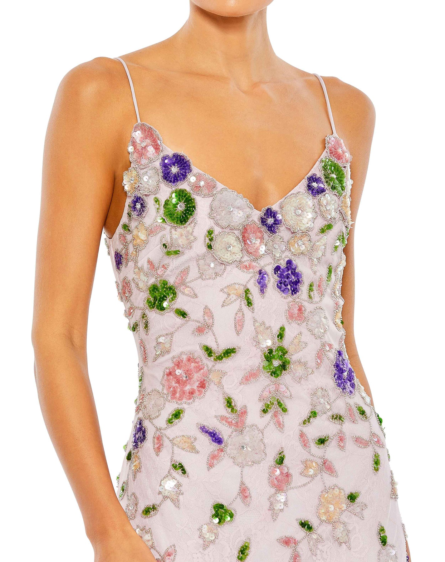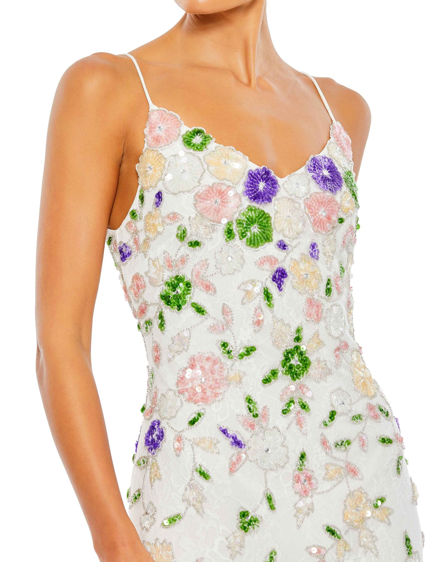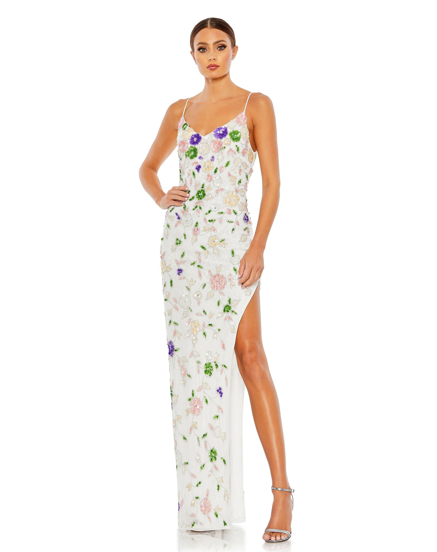 Unleash your inner goddess with the Mac Duggal 10893 Dress. Featuring a hand-embellished lace overlay and a delicate floral pattern, this gown exudes elegance and charm. The V-neckline and thigh-high side slit give a touch of drama, perfect for special occasions. Available in two beautiful colors.