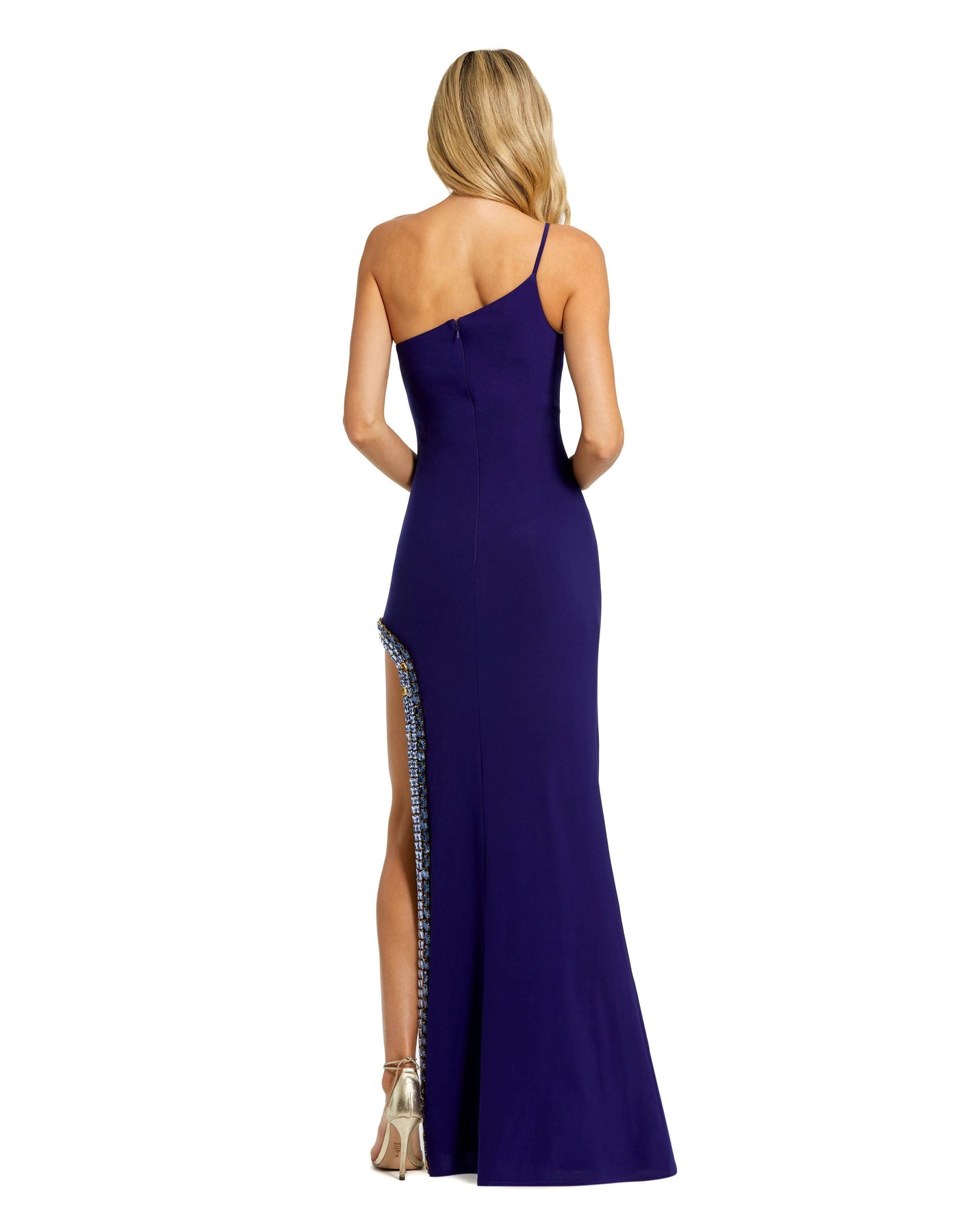 This glamorous One Shoulder Gown is made from high-quality jersey fabric, providing both comfort and style. The asymmetrical one shoulder neckline adds a modern touch, while the embellished thigh high slit adds a touch of sophistication. Perfect for any formal occasion.