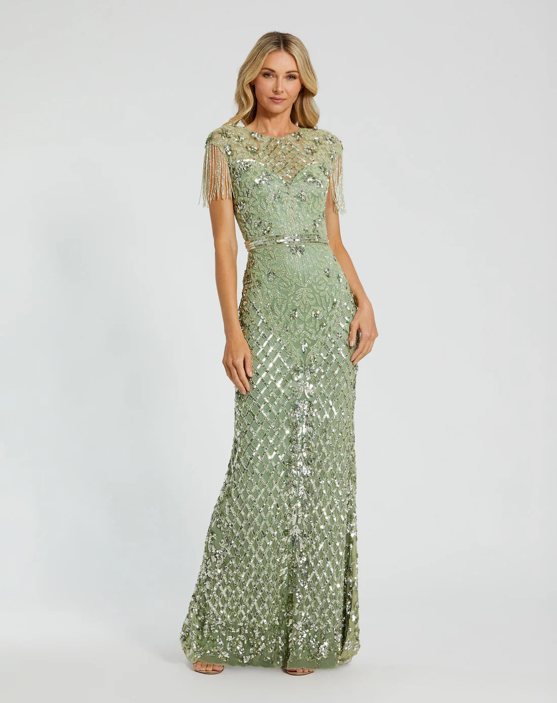 Full length gown with sequins, jeweled tasseled sleeves, and faux belt.