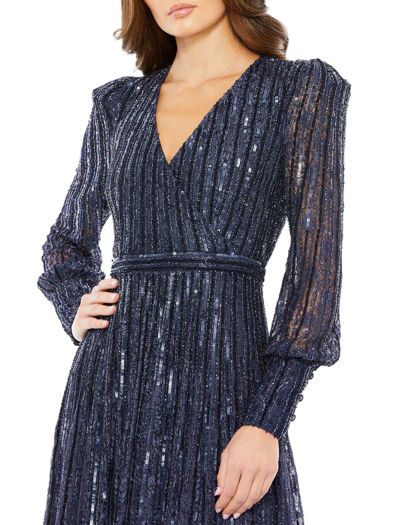 - Fully lined through bodice and skirt; semi-sheer unlined long sleeves