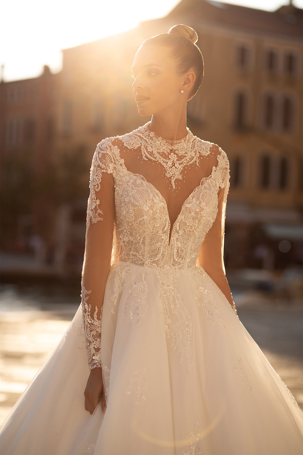 Make a bold statement on your wedding day with the MARIA ANETTE 5406 Dress. This ballgown features a daring V neckline complemented by an illusion high neckline adorned with intricate appliqués. Long sheer sleeves, also embellished with detailed appliqué work, add an elegant yet edgy touch. Perfect for brides who want to blend classic romance with fearless style.