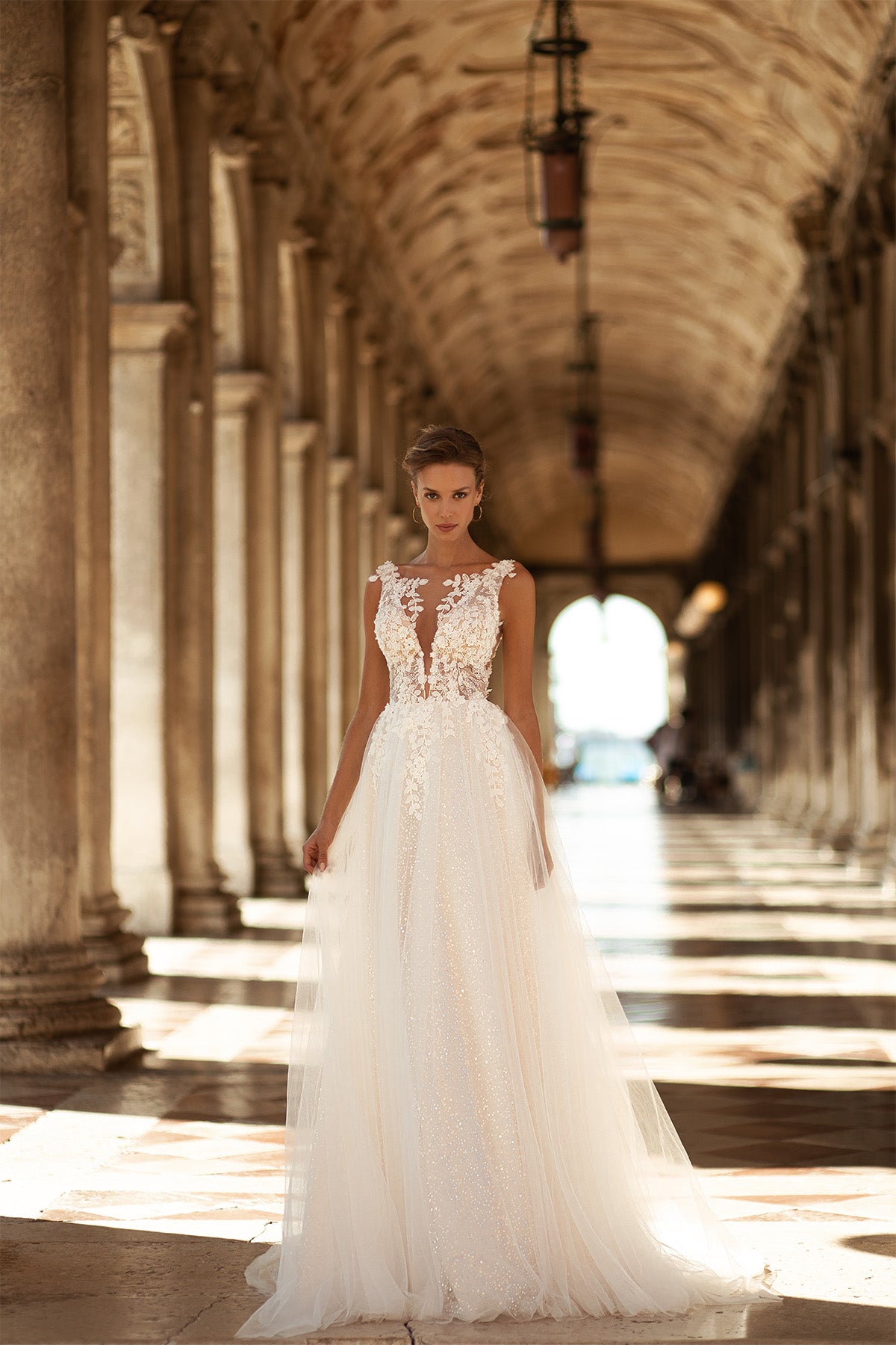 Expertly crafted with a stunning open back design, the MARIA ANETTE 5433 is the perfect bridal dress for any special occasion. Its long silhouette and intricate details exude elegance and sophistication, making you feel like a true princess on your big day.