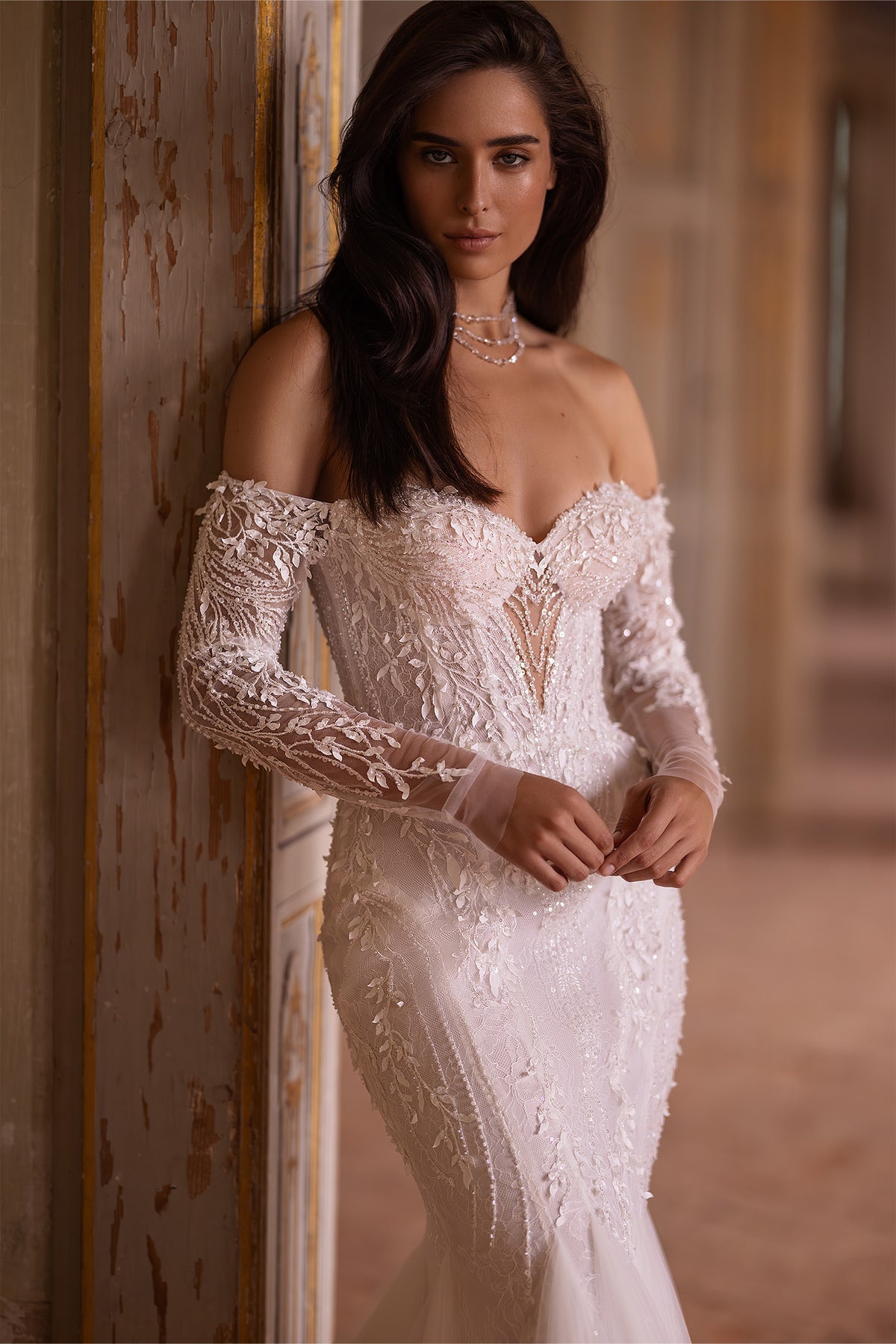 The MARIA ANETTE 5501 Dress is a bold choice for the bride who wants to captivate. Its Mermaid silhouette sculpts the figure, while the sweetheart neckline and off-shoulder sleeves add a seductive touch. Beaded floral appliqués shimmer with every movement, creating a striking blend of elegance and daring flair. This gown is designed to make a fearless statement on your wedding day.