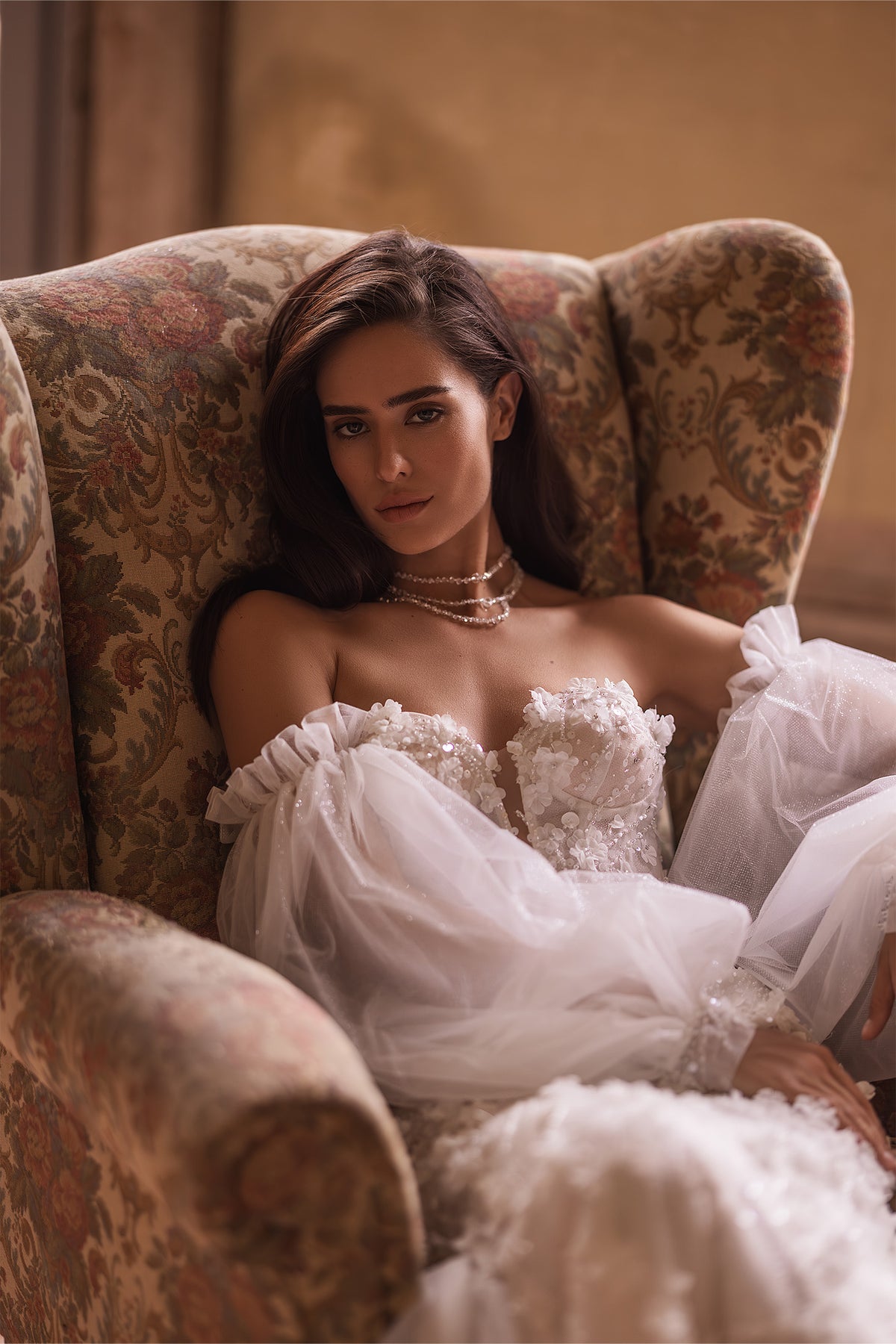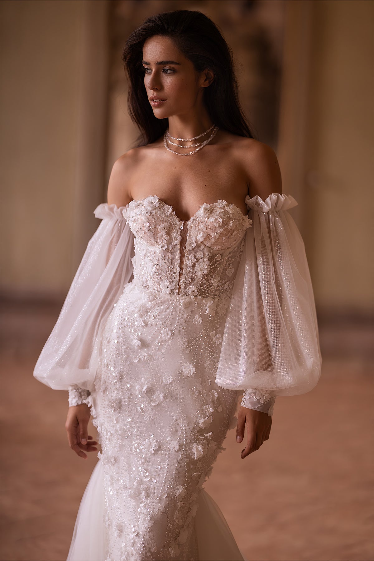 The MARIA ANETTE 5511 Dress combines daring elegance with romantic details. Featuring a strapless sweetheart neckline and off-the-shoulder bishop sleeves, this mermaid silhouette gown hugs your curves while showcasing a lace bodice adorned with intricate 3D floral appliqués. Perfect for the bride who wants to captivate with bold sophistication and timeless beauty.