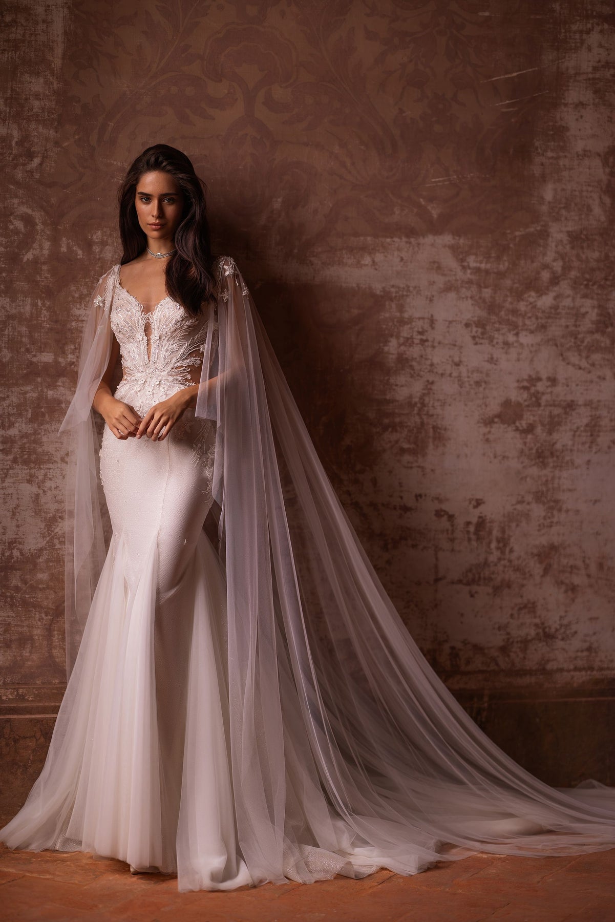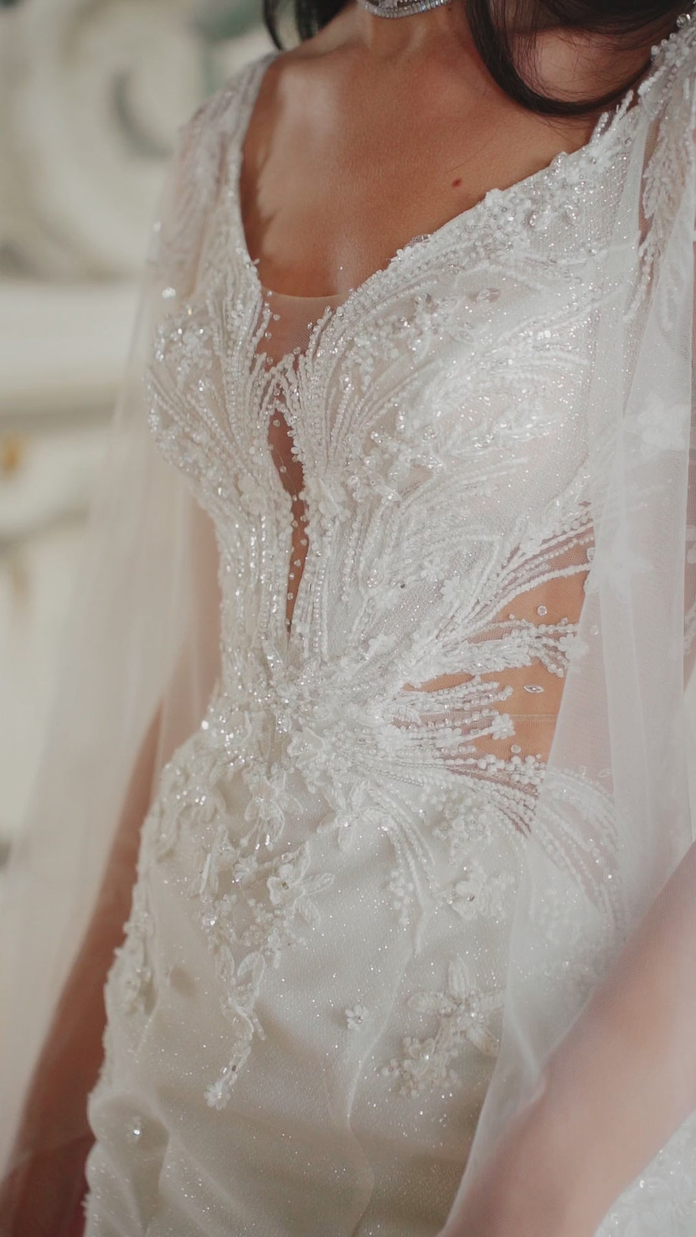 The MARIA ANETTE 5513 Dress is a daring bridal gown featuring a striking V neckline and open V backline. Sleeveless with delicate spaghetti straps, it showcases intricate 3D beaded floral appliqués that add texture and sparkle. Two long shoulder trails flow gracefully, enhancing the gown’s long silhouette for a bold and unforgettable bridal look.